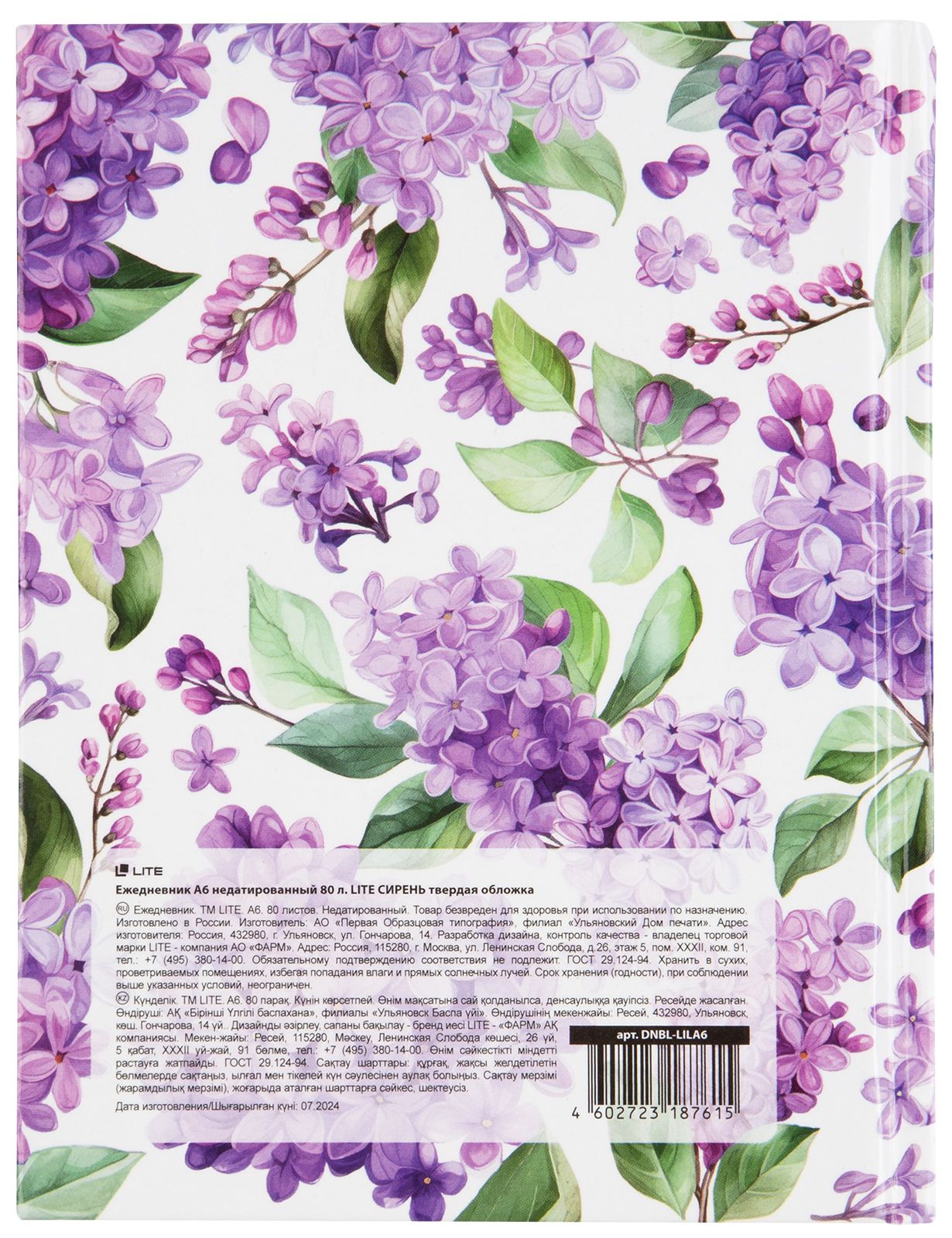 Формат: А6 Количество листов: 80 Материал обложки: картон Линовка: линия Вид изделия: Ежедневник Степень датированности: недатированный Мин. партия и варианты упаковок: 1 / 40 Ежедневник А6 недатированный LITE СИРЕНЬ 80 л. с дизайном, твердая обложка картон, глянцевая ламинация