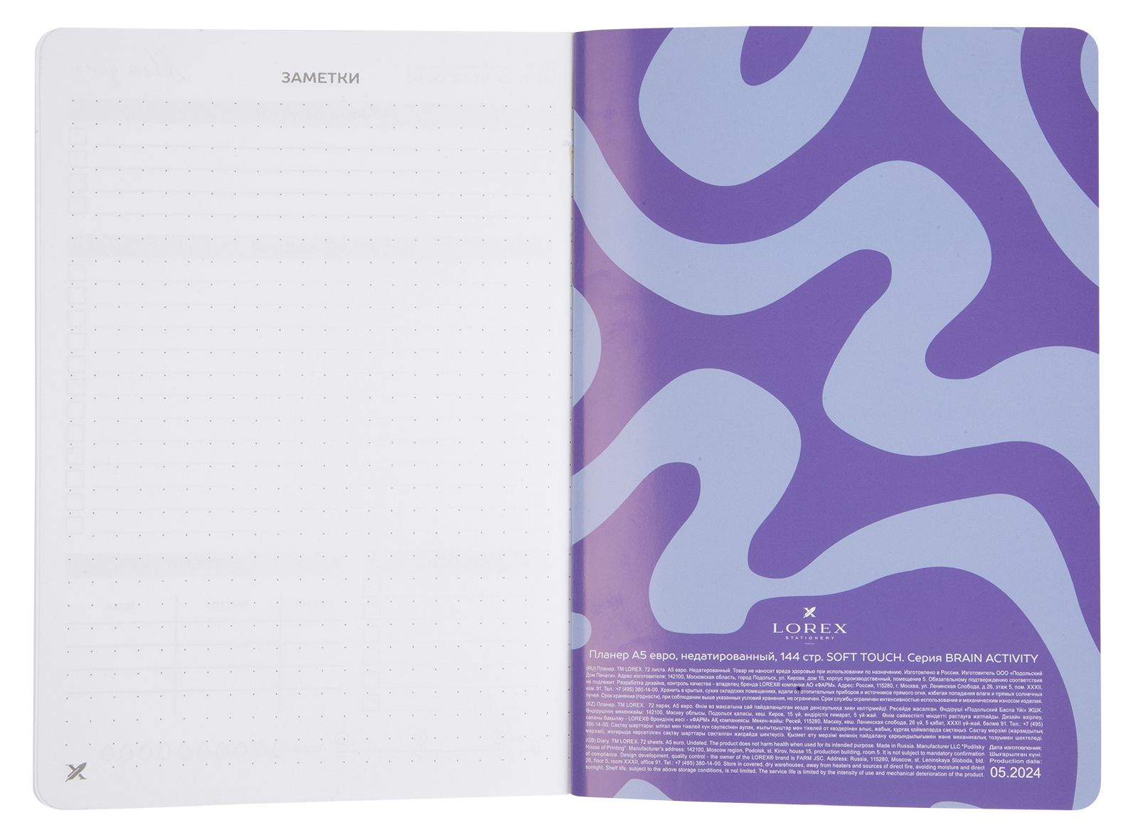 Формат: А5 Количество листов: 72 Тип крепления: швейно-клеевое Материал обложки: мелованный картон Вид изделия: Планер Степень датированности: недатированный Мин. партия и варианты упаковок: 1 / 36 Планер недатированный LOREX BRAIN ACTIVITY 145х205 мм 72 л. с дизайном мягкая обложка, мелованный картон, soft touch