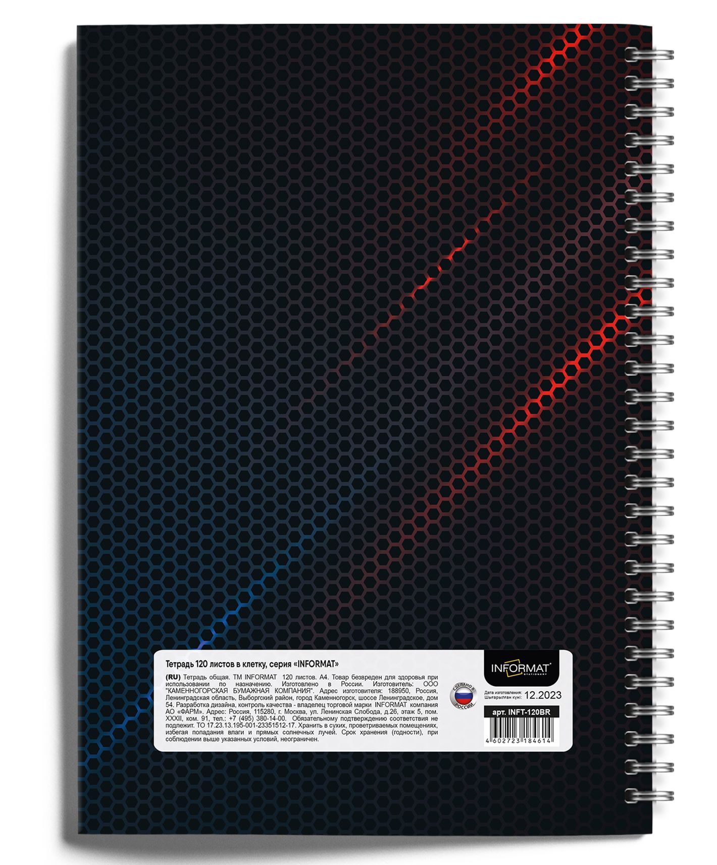 Формат: А4 Количество листов: 120 Тип крепления: гребень Материал обложки: мелованный картон Линовка: клетка Размер: 205х290 мм Мин. партия и варианты упаковок: 1 / 2 / 14 Тетрадь 120 л. А4 клетка, на гребне, INFORMAT ГЕРБ офсет, мелованный картон, матовая ламинация