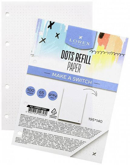 Сменный блок LOREX DOTS для тетрадей на кольцах для тех, кто хочет выделяться! Линовка блока - серая точка. Количество листов в комплекте 100 штук - их точно хватит надолго. Формат листов А5 усеченный (195*140 мм). Данный формат идеально подходит под тетради на кольцах LOREX.Делай так, как тебе нравится! Комбинируй, выделяйся!