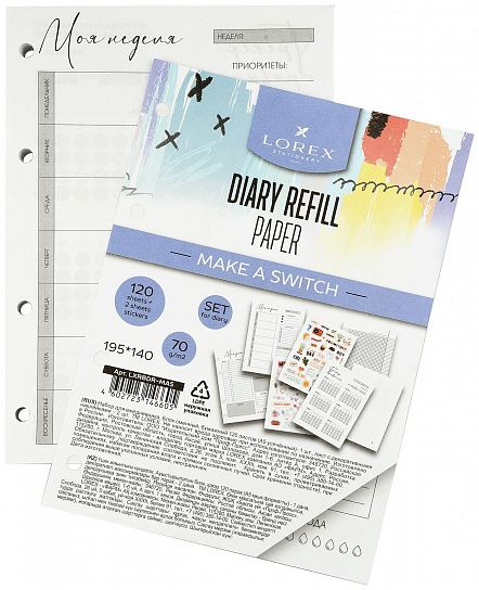 Набор для ежедневника LOREX DIARY - настоящая находка для тех, кто любит создавать вещи своими руками. Поробуй сделай свои идеальный ежедневник!В комплект входит 5 видов линованных листов и 2 листа с наклейками.Листы с еженедельником помогут записать самые важные дела на будущие 7 дней. На обратной стороне листов напечатан трекер привычек. Отличный способ отслеживать свой прогресс в здоровых привычках!Листы с ежедневными задачами продолжат план на день более детально. А листы в серую клетку и точку можно использовать для учебы или работы.Теперь твоя тетрадь будет еще универсальнее!Количество листов в комплекте 120 штук + 2 листа с красочными наклейками. Формат листов А5 усеченный (195*140 мм). Данный формат идеально подходит под тетради на кольцах LOREX.Делай так, как тебе нравится! Комбинируй, выделяйся!