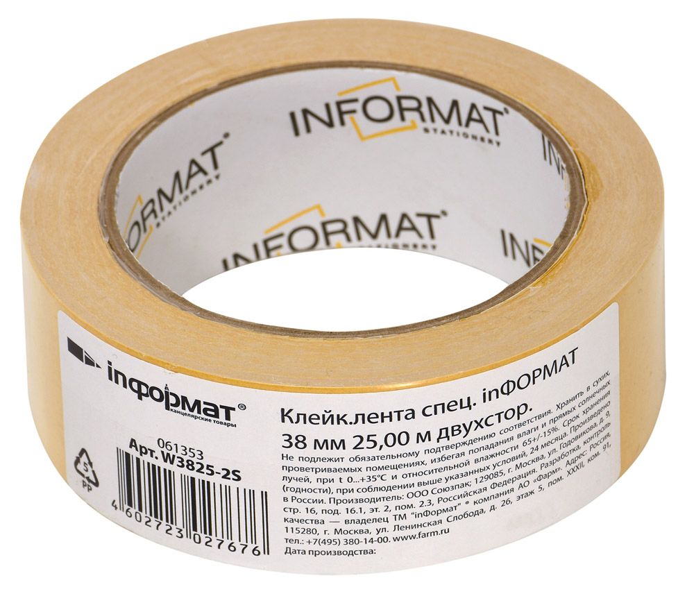 Ширина, мм: 38 Длина, м: 25,00 Толщина, мкм: 70 Цвет: прозрачная Торговая марка: INFORMAT Материал основы: ВОРР (двуосноориентированная ПП пленка) Мин. партия и варианты упаковок: 1 / 48 -