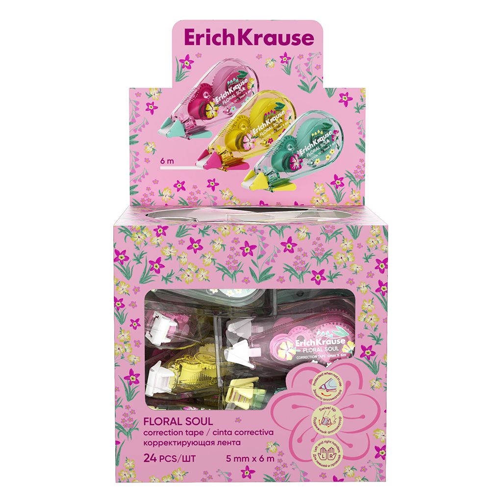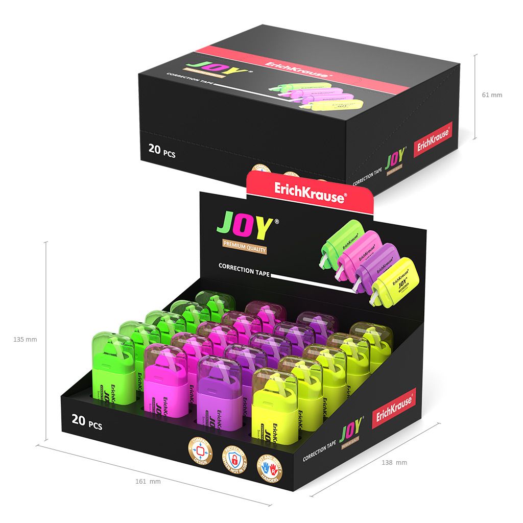 Механизм корректора: прямой ход ленты Цвет корпуса: ассорти Упаковка: дисплей Серия: JOY Торговая марка: ErichKrause Эргономичный корпус: Нет Мин. партия и варианты упаковок: 1 / 20 / 600 -