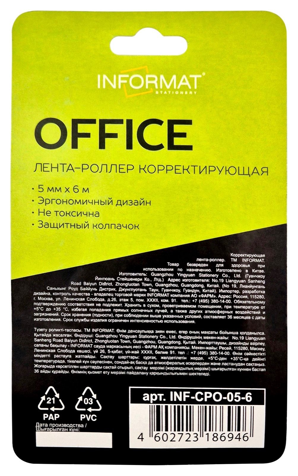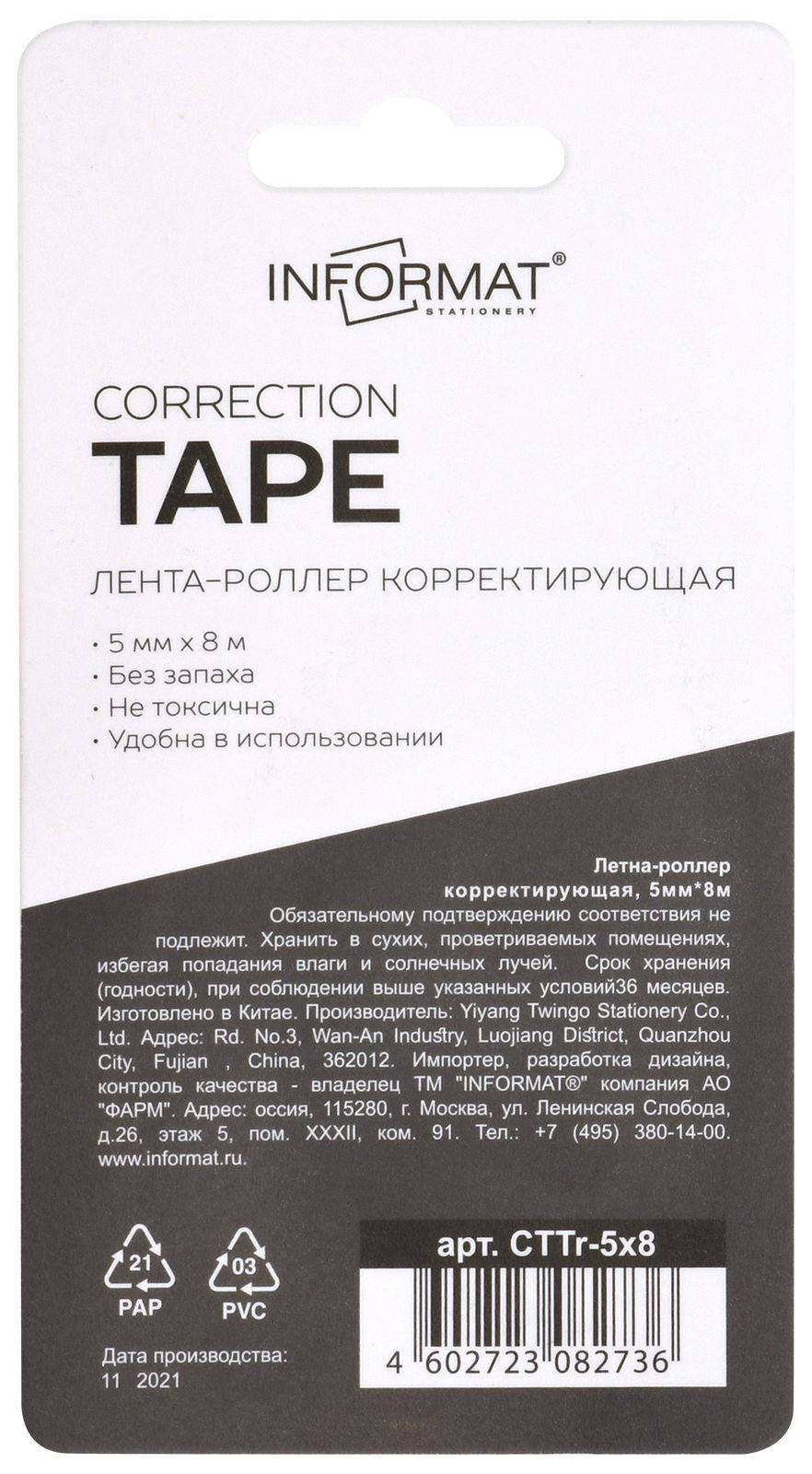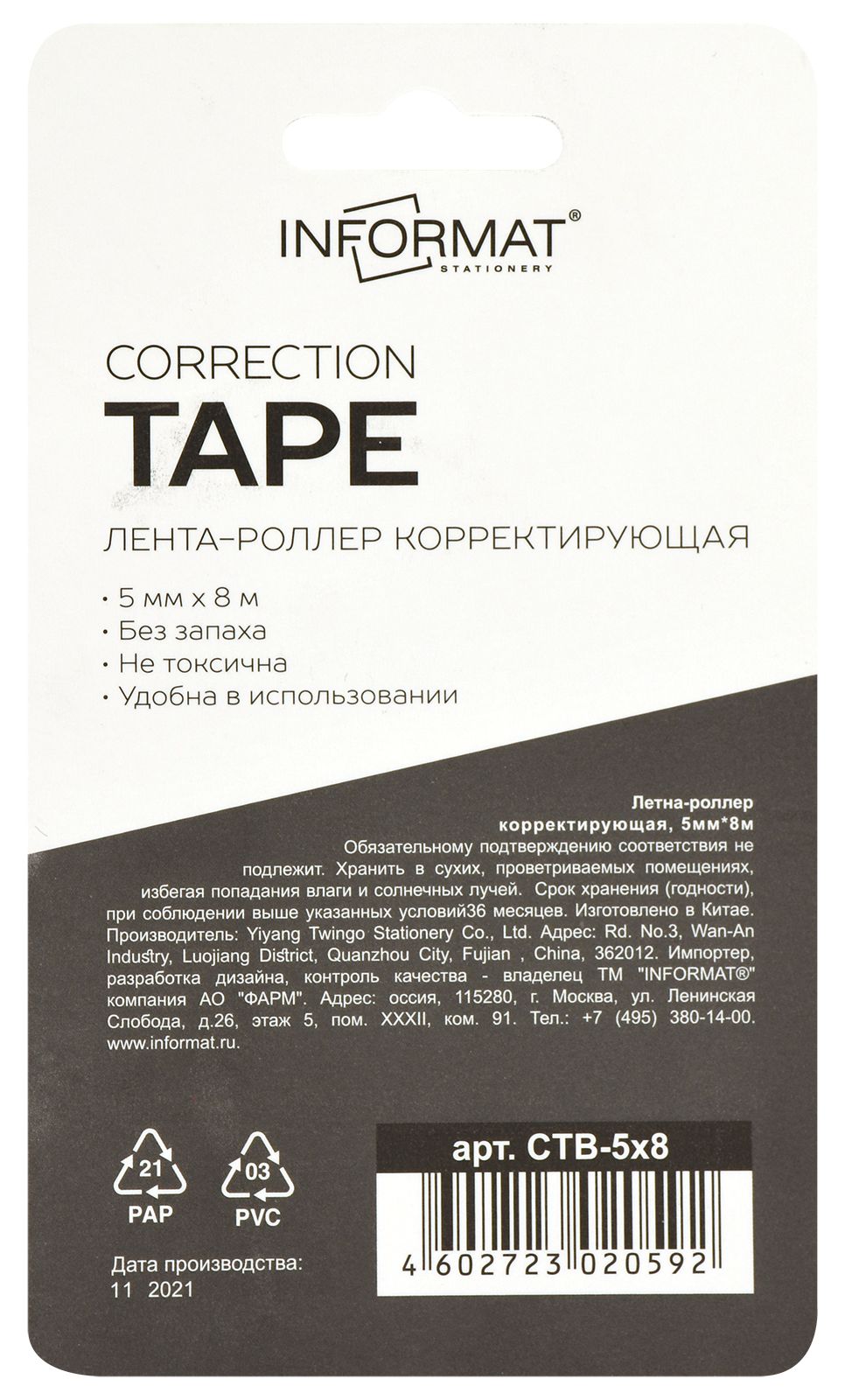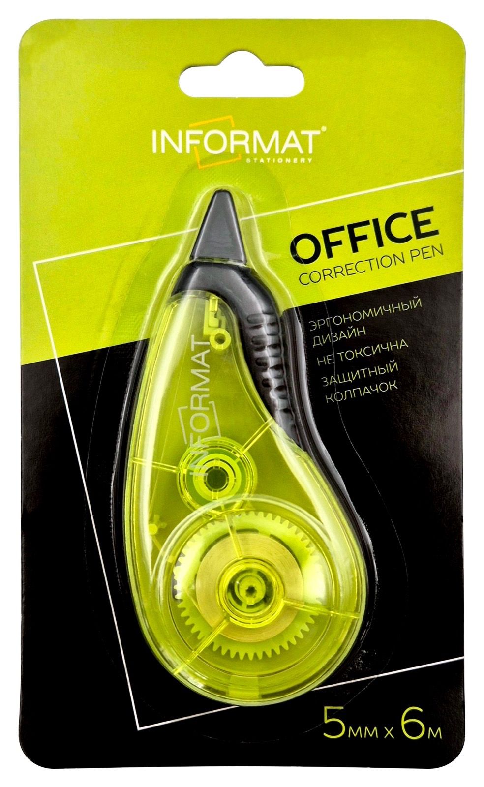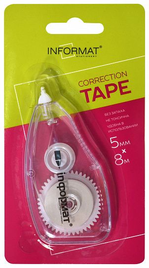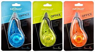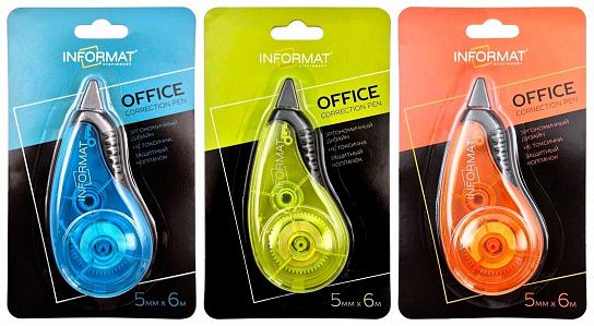 Механизм корректора: прямой ход ленты Цвет корпуса: ассорти Упаковка: блистер Серия: OFFICE Торговая марка: INFORMAT Размер корпуса (ДхШхВ), мм: 99х45х17 мм Мин. партия и варианты упаковок: 1 / 24 / 144 -