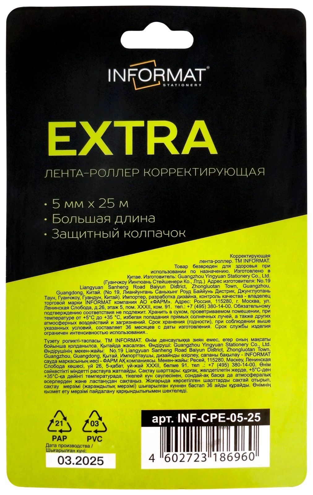 Механизм корректора: прямой ход ленты Цвет корпуса: черный Упаковка: блистер Серия: EXTRA Торговая марка: INFORMAT Размер корпуса (ДхШхВ), мм: 11х56х14,6 мм Мин. партия и варианты упаковок: 1 / 24 / 432 -