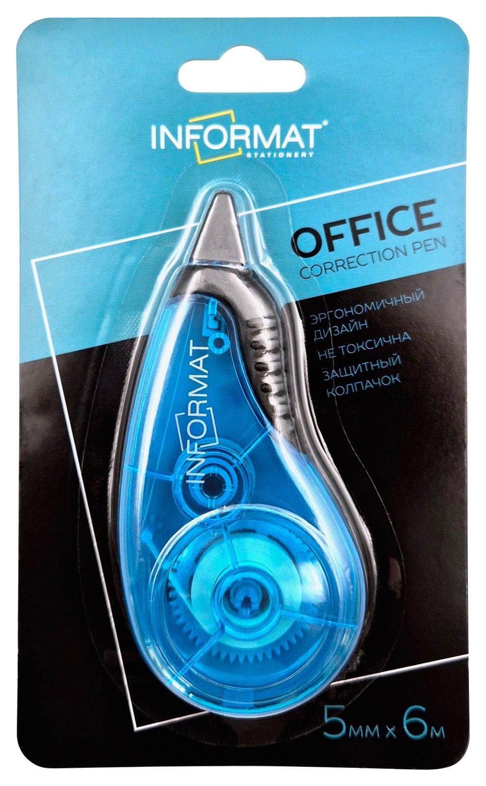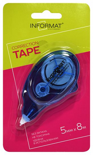 Механизм корректора: прямой ход ленты Цвет корпуса: голубой Упаковка: блистер Торговая марка: INFORMAT Размер корпуса (ДхШхВ), мм: 52х98х14 мм Эргономичный корпус: Нет Мин. партия и варианты упаковок: 1 / 12 / 288 -