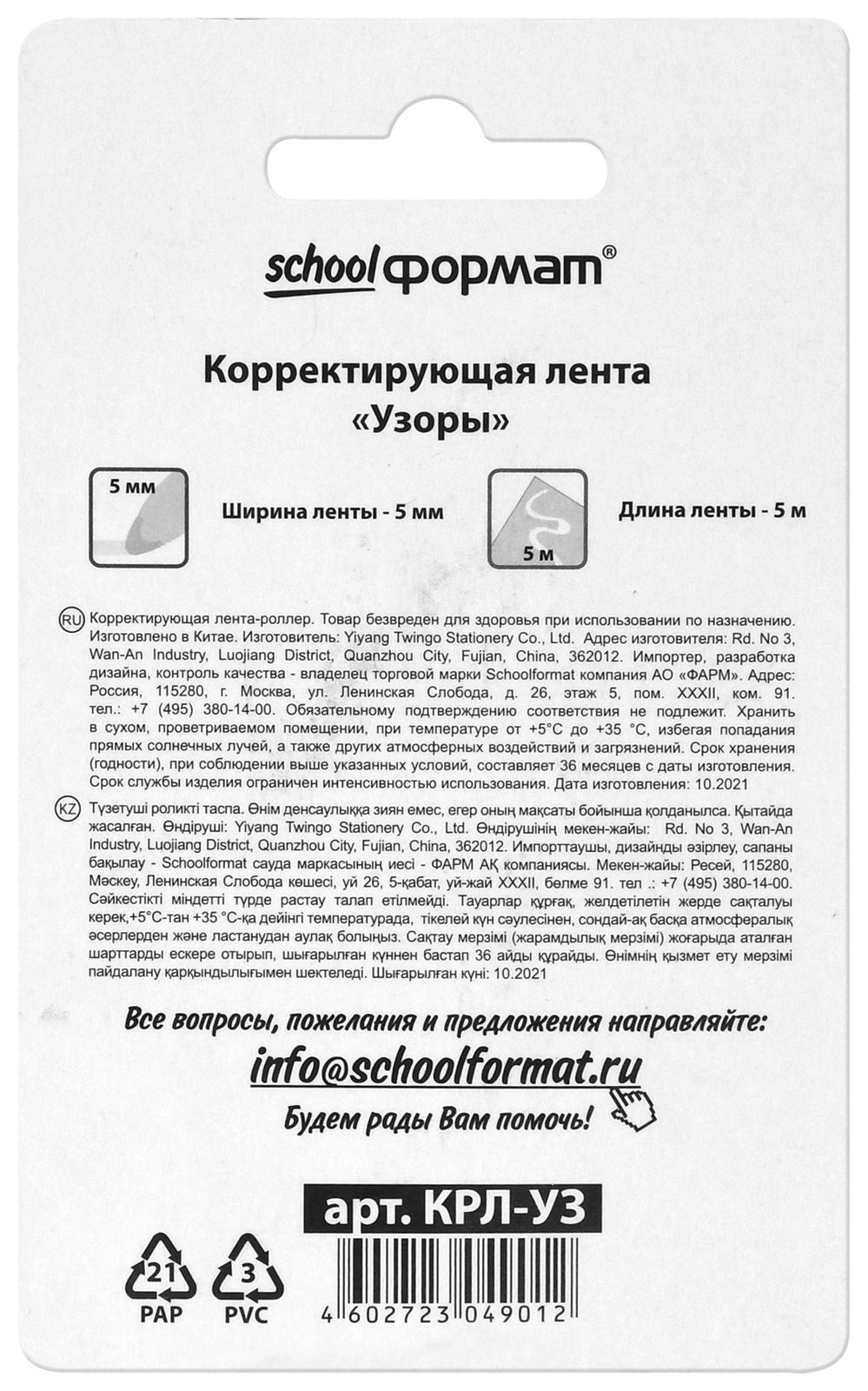 Механизм корректора: прямой ход ленты Цвет корпуса: ассорти Упаковка: блистер Серия: УЗОР Торговая марка: Schoolformat Размер корпуса (ДхШхВ), мм: 34х80х13 мм Мин. партия и варианты упаковок: 1 / 12 / 288 -