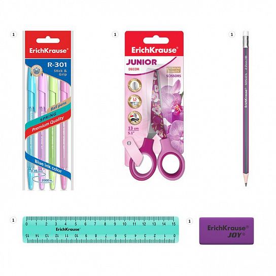 | Комплектация набора: | 4 ручки, карандаш, линейка, ластик, ножницы |