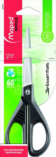 Наличие европодвеса: Да Упаковка: картонная упаковка Серия: GREEN Модель: ESSENTIALS Цвет основной: черный Длина ножниц, мм: 170 Мин. партия и варианты упаковок: 1 / 24 / 192 Ножницы MAPED ESSENTIALS GREEN 170 мм черные, эргономичные ручки пластиковые