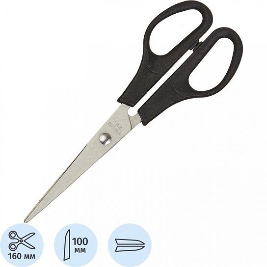 Наличие европодвеса: Да Упаковка: пакет Цвет основной: черный Длина ножниц, мм: 160 Длина лезвия, мм: 100 Материал ручек: пластик Мин. партия и варианты упаковок: 1 / 24 / 480 -