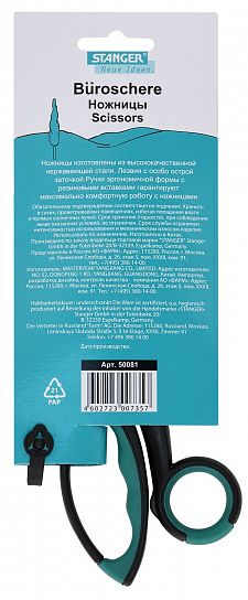 Ножницы из высококачественной нержавеющей стали в упаковке с европодвесом. Лезвия с особо острой заточкой. Ручки эргономичной формы с резиновыми вставками гарантируют максимально комфортную работу с ножницами.