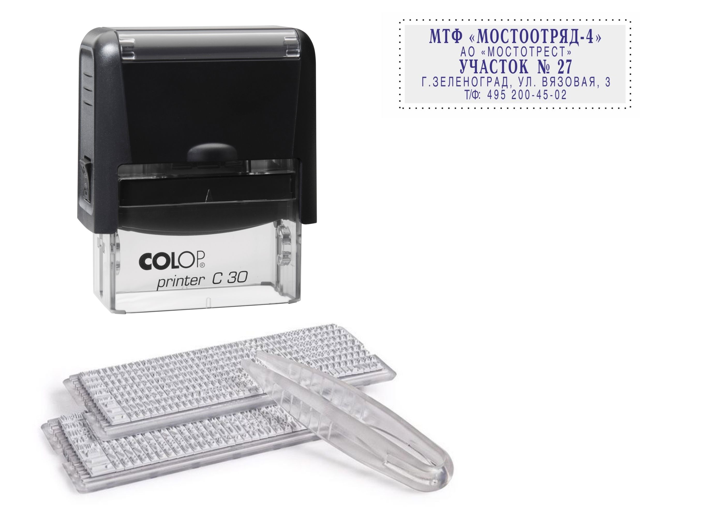 Материал: пластик Тип: самонаборный Вид штемпельных принадлежностей: Штамп Цвет чернил: синий Форма: прямоугольная Размер оттиска: 30х69 мм Мин. партия и варианты упаковок: 1 / 25 -
