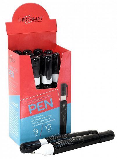 Механизм корректора: маталлический наконечник Объем, мл: 9 Цвет корпуса: черный Упаковка: картонный дисплей Основное вещество корректора (состав): спиртовая Торговая марка: INFORMAT Мин. партия и варианты упаковок: 1 / 12 / 72 -