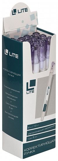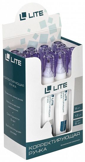 Механизм корректора: маталлический наконечник Объем, мл: 6 Цвет корпуса: белый Упаковка: картонный дисплей Основное вещество корректора (состав): спиртовая Торговая марка: LITE Мин. партия и варианты упаковок: 1 / 12 / 144 -