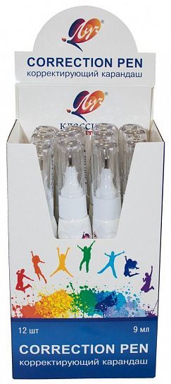 Механизм корректора: маталлический наконечник Объем, мл: 9 Цвет корпуса: белый Упаковка: картонный дисплей Основное вещество корректора (состав): растворитель Торговая марка: Луч Мин. партия и варианты упаковок: 1 / 72