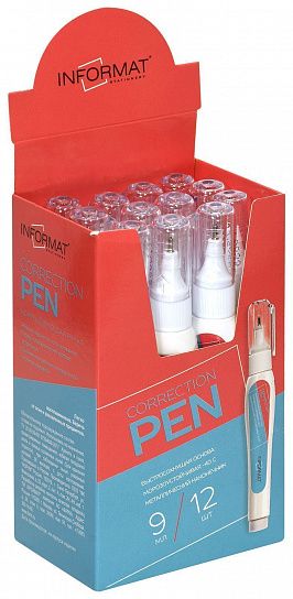 Механизм корректора: маталлический наконечник Объем, мл: 9 Цвет корпуса: белый Упаковка: картонный дисплей Основное вещество корректора (состав): спиртовая Торговая марка: INFORMAT Мин. партия и варианты упаковок: 1 / 12 / 72 -