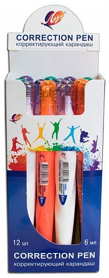Механизм корректора: маталлический наконечник Объем, мл: 6 Цвет корпуса: ассорти Упаковка: картонный дисплей Основное вещество корректора (состав): растворитель Торговая марка: Луч Мин. партия и варианты упаковок: 1 / 216 -