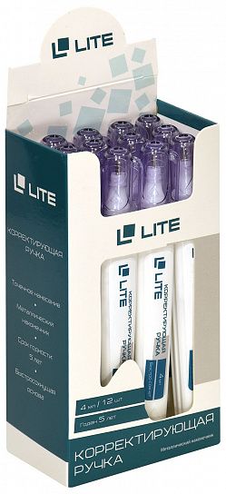Механизм корректора: маталлический наконечник Объем, мл: 4 Цвет корпуса: белый Упаковка: картонный дисплей Основное вещество корректора (состав): быстросохнущая Торговая марка: LITE Мин. партия и варианты упаковок: 1 / 12 / 1200 -