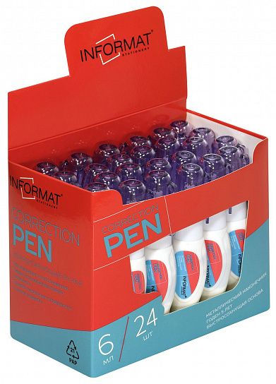 Механизм корректора: маталлический наконечник Объем, мл: 6 Цвет корпуса: белый Упаковка: картонный дисплей Основное вещество корректора (состав): быстросохнущая Торговая марка: INFORMAT Мин. партия и варианты упаковок: 1 / 24 / 576 -