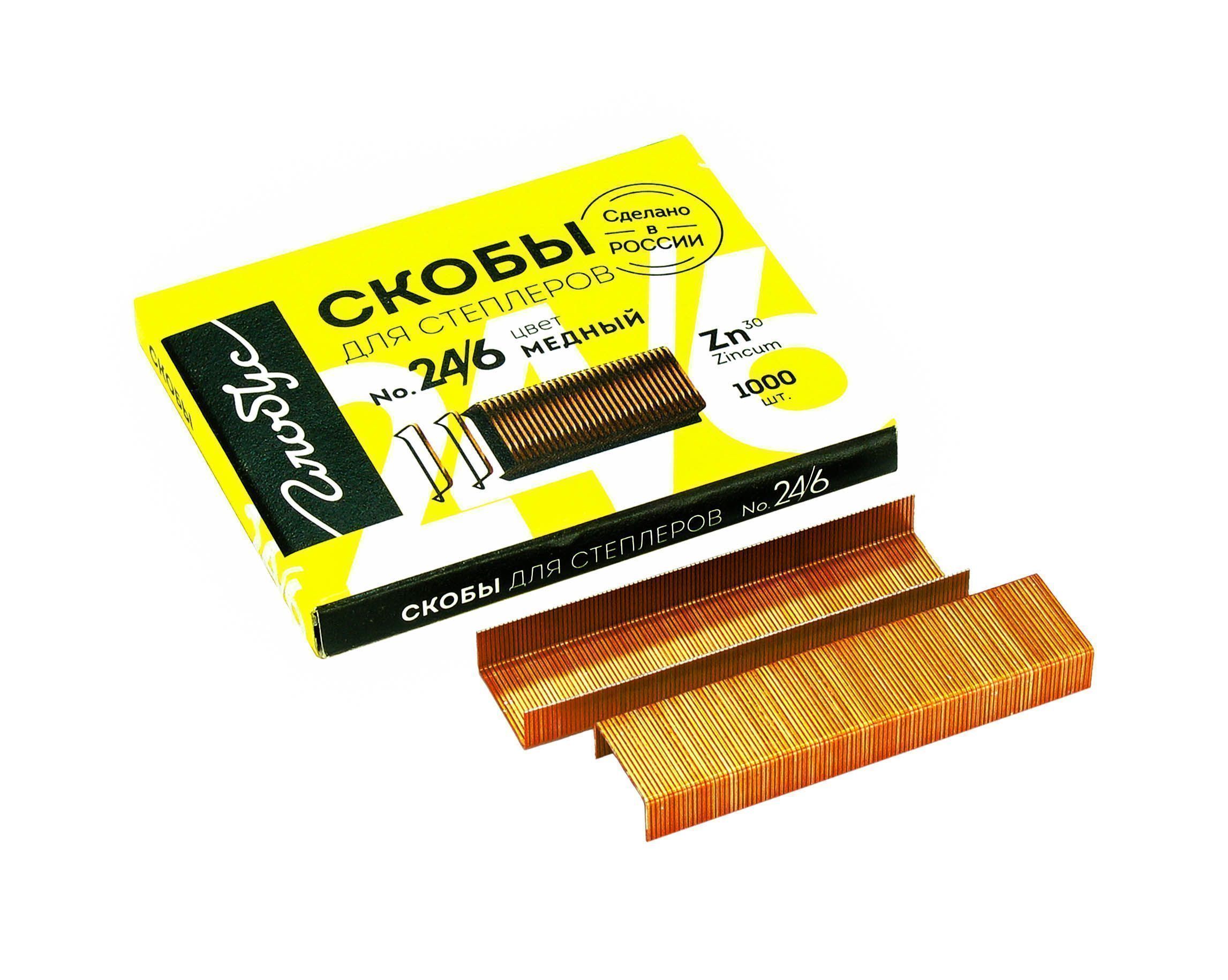 Скобы для степлера № 24/6 выполнены из качественного металла с полимерным медным покрытием. Предназначены для степлеров со сшивающей способностью до 25 листов (для бумаги толщиной 0,07 и 0,08 мм).В картонной упаковке 1000 скоб.