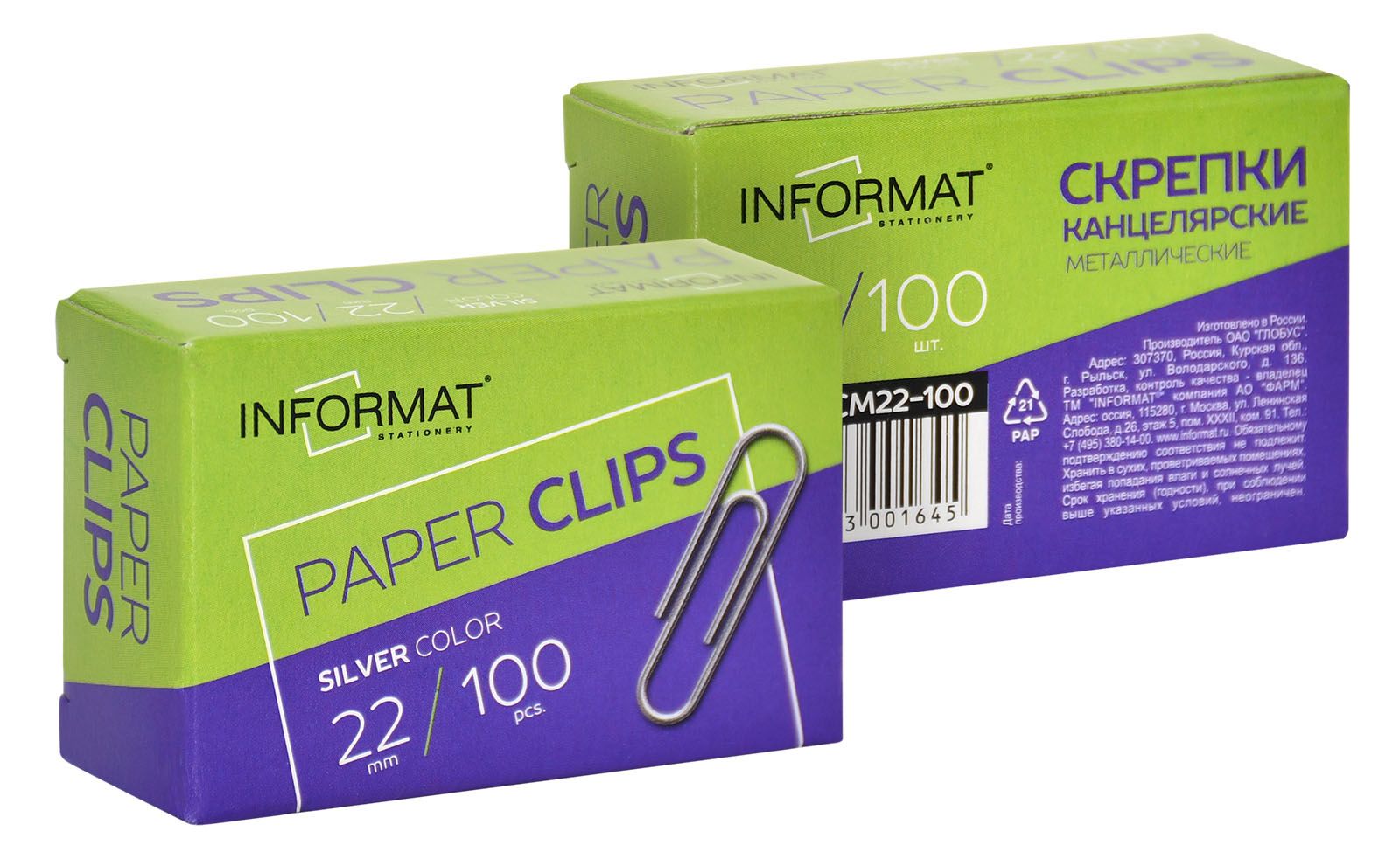 INFORMAT реализует канцелярские скрепки по доступным ценам. Они производятся из качественных сплавов, поэтому выдерживают до пяти сгибаний под прямым углом. Их поверхность не имеет заусениц и остатков смазки, которые могут испортить документ. Оптимальный состав металла наряду с защитно-декоративными покрытиями предохраняет продукцию от ржавления.