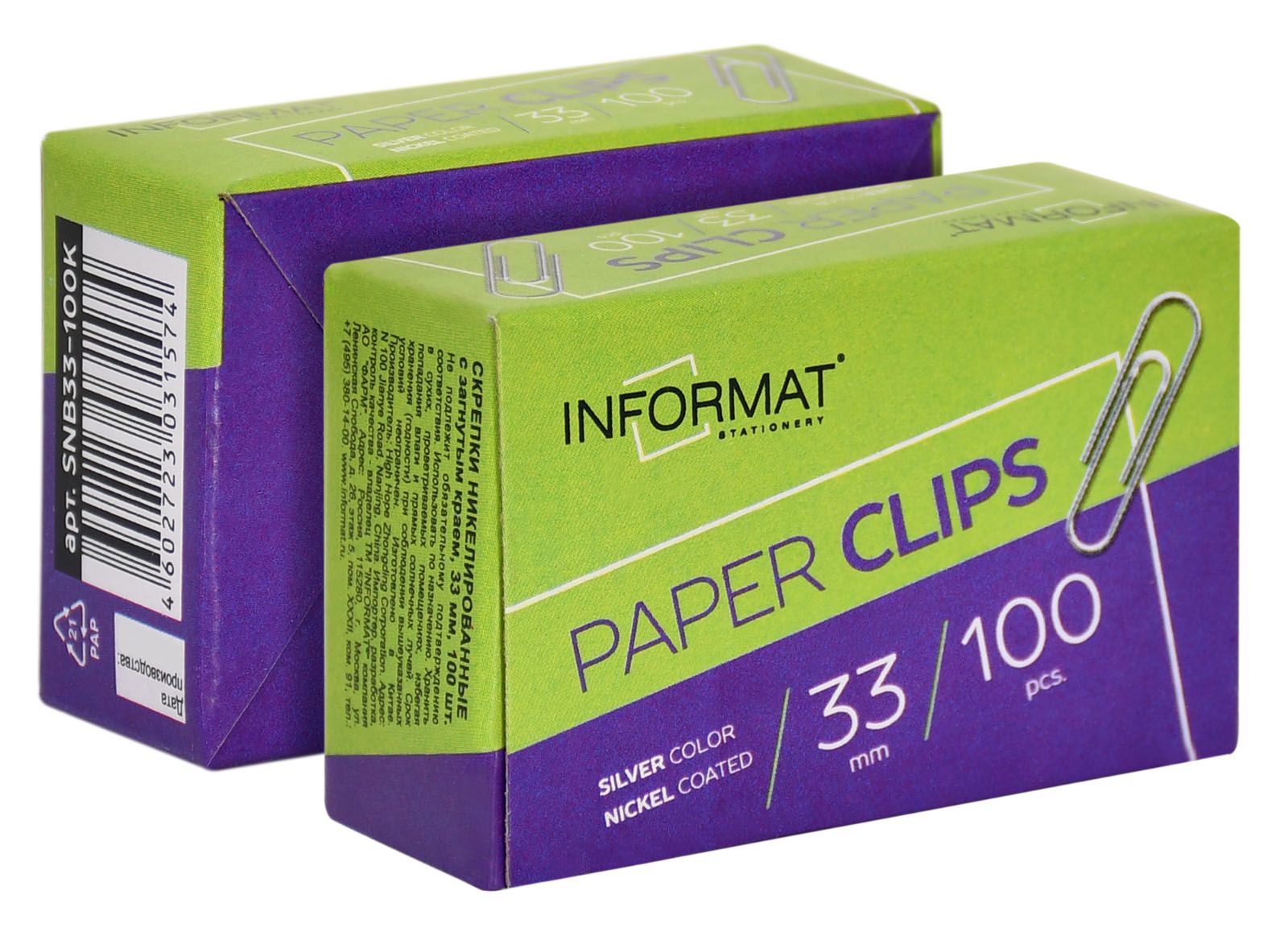 Цвет: серебро Количество в упаковке, шт: 100 Материал: металл Размер, мм: 33 Упаковка: картонная упаковка Тип скрепок: с загнутым краем Мин. партия и варианты упаковок: 1 / 10 / 500 -