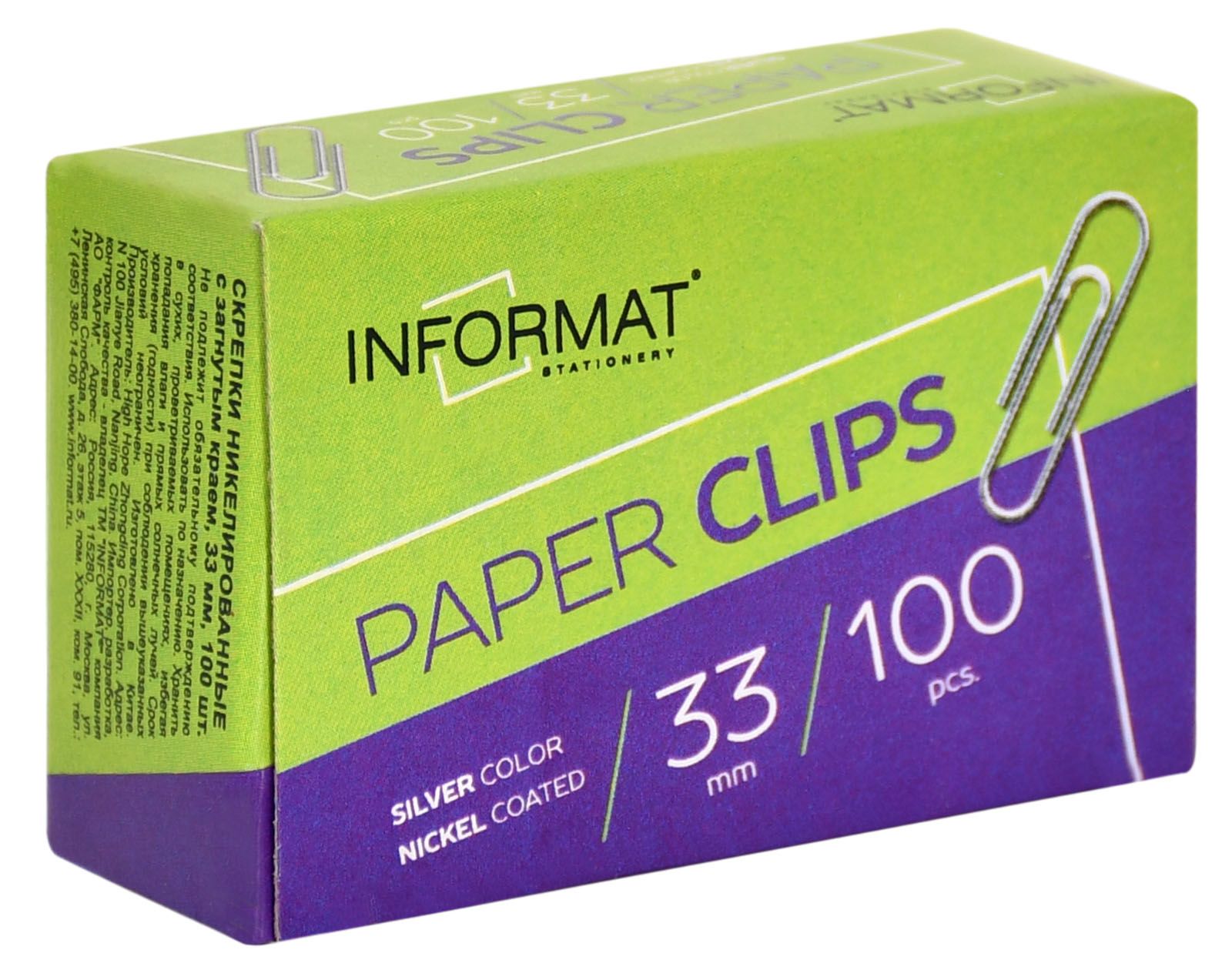 INFORMAT реализует канцелярские скрепки по доступным ценам. Они производятся из качественных сплавов, поэтому выдерживают до пяти сгибаний под прямым углом. Их поверхность не имеет заусениц и остатков смазки, которые могут испортить документ. Оптимальный состав металла наряду с защитно-декоративными покрытиями предохраняет продукцию от ржавления.