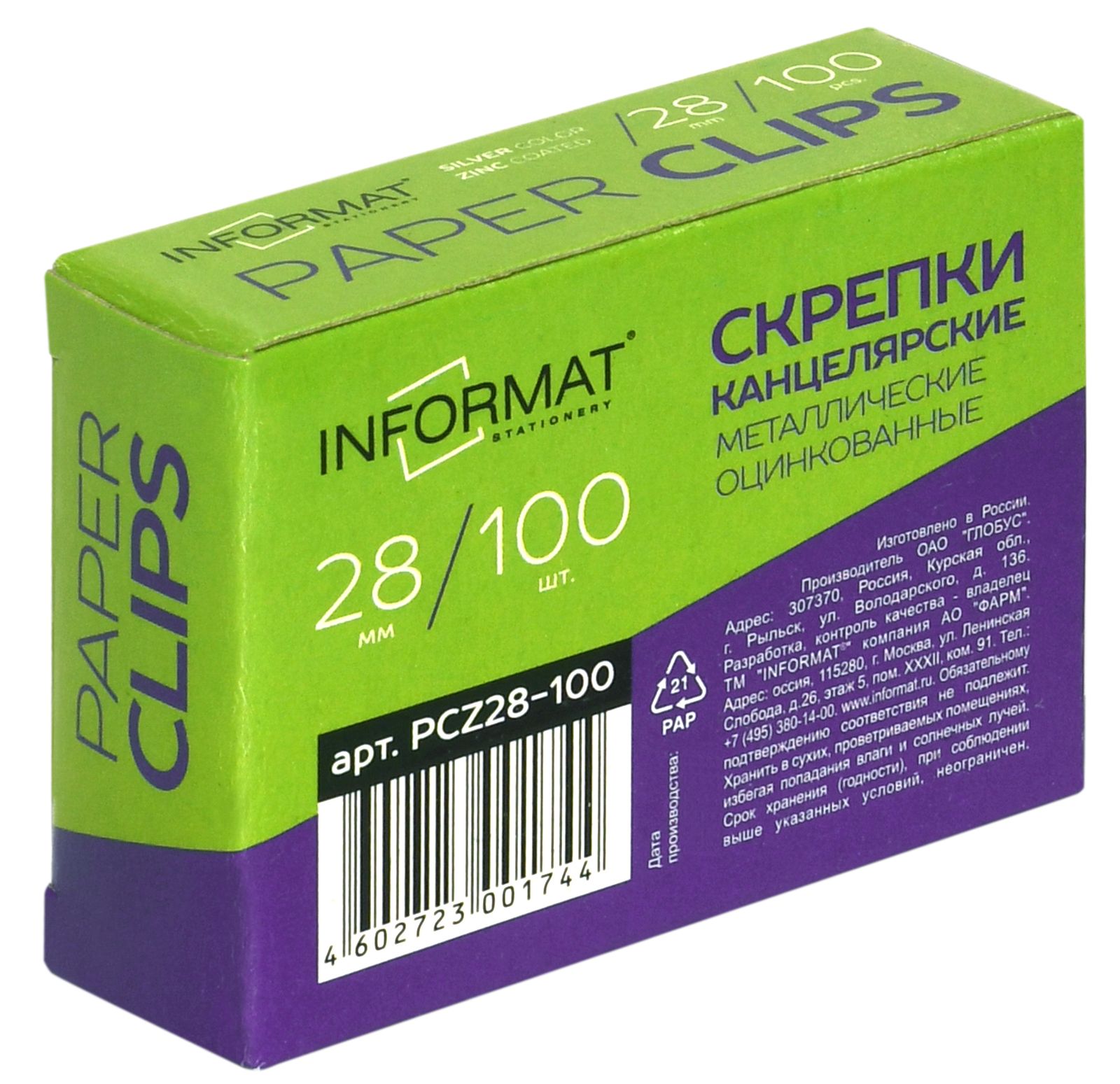 Цвет: серебро Количество в упаковке, шт: 100 Материал: металл Размер, мм: 28 Упаковка: картонная упаковка Тип скрепок: с загнутым краем Мин. партия и варианты упаковок: 1 / 10 / 500 -