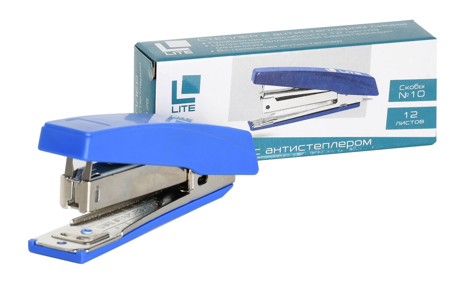 Цвет: синий Материал: пластик Наличие антистеплера: Да Регулятор глубины закладки бумаги: Нет Размер, см: 9,30 Высота, см: 3,80 Мин. партия и варианты упаковок: 1 / 12 / 240 Степлер LITE №10 до 12 листов, пластик, синий
