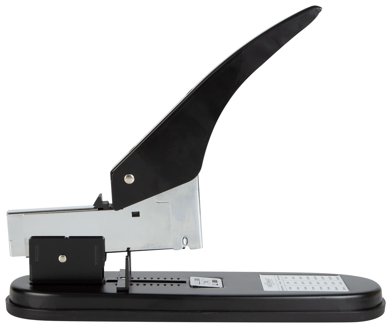 - Сверхмощные. Усиленные литые узлы и регулируемая глубина перфорации. Длинный рычаг позволяет снизить объем применяемой силы (до 30 %). Сверхмощные устройства могут сшивать большие объемы бумаги — от 50 до 100 листов и более.