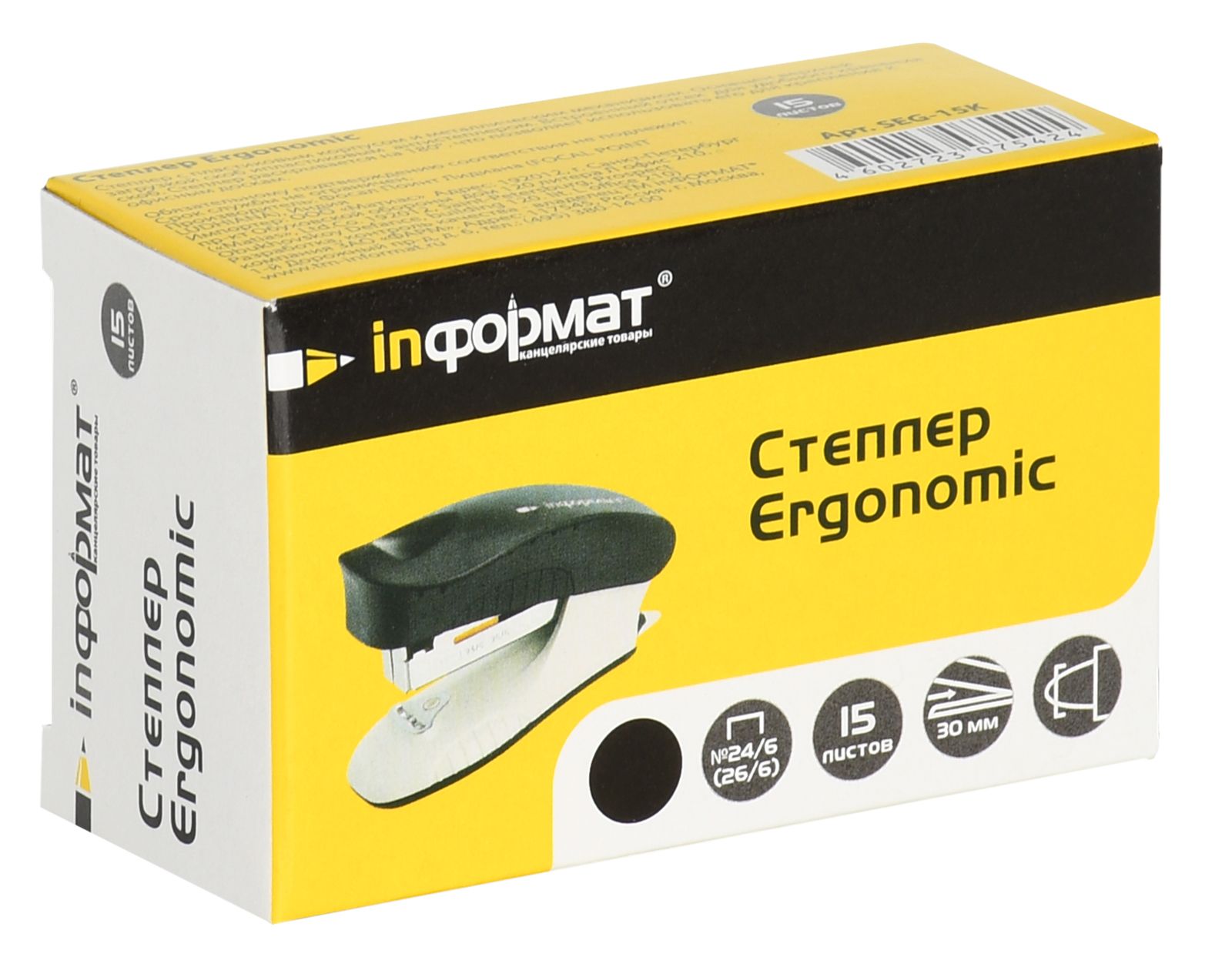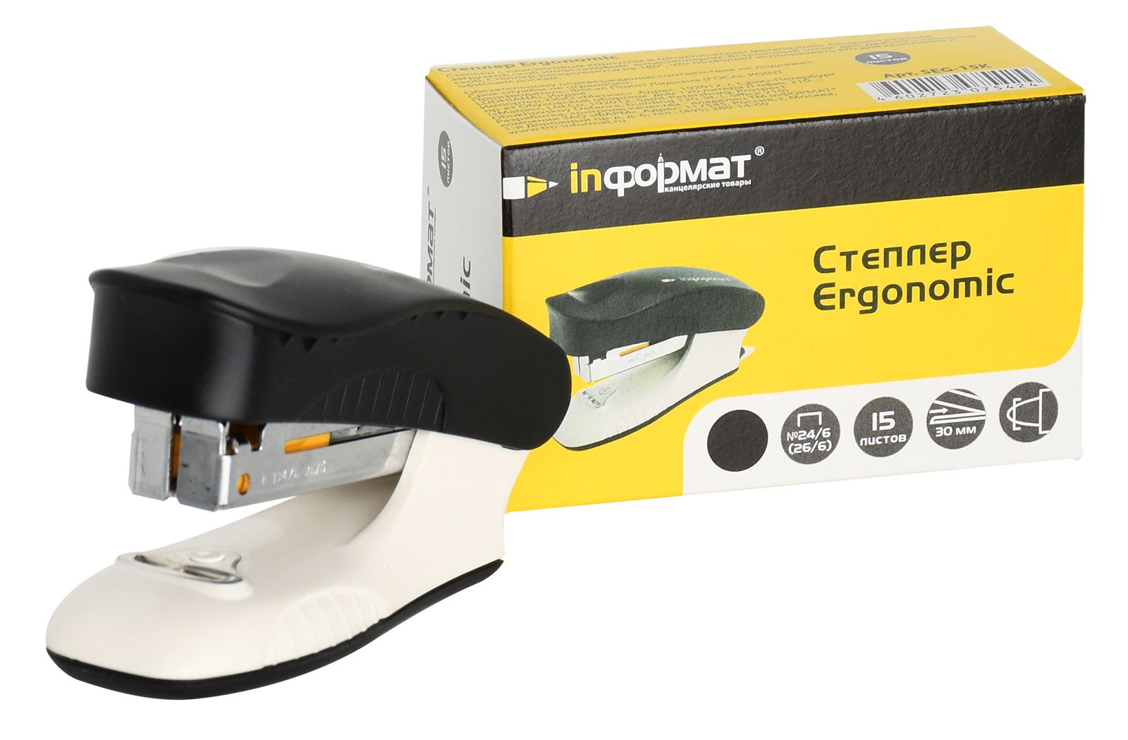Цвет: черный Материал: пластик Наличие антистеплера: Да Регулятор глубины закладки бумаги: Нет Размер, см: 7,50 Высота, см: 4,50 Мин. партия и варианты упаковок: 1 / 10 / 120 / 240 Степлер INFORMAT ERGONOMICS №24/6, 26/6 до 15 листов, пластик, черный