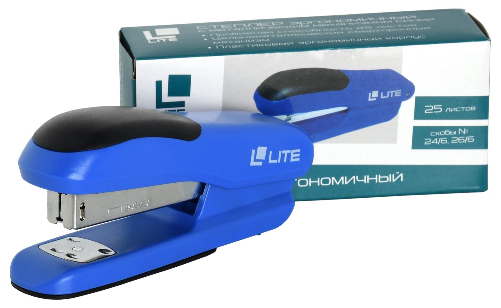 Цвет: синий Материал: пластик Наличие антистеплера: Нет Регулятор глубины закладки бумаги: Нет Размер, см: 12,50 Высота, см: 5,30 Мин. партия и варианты упаковок: 1 / 12 / 120 Степлер LITE №24/6, 26/6 до 25 листов, пластик, синий