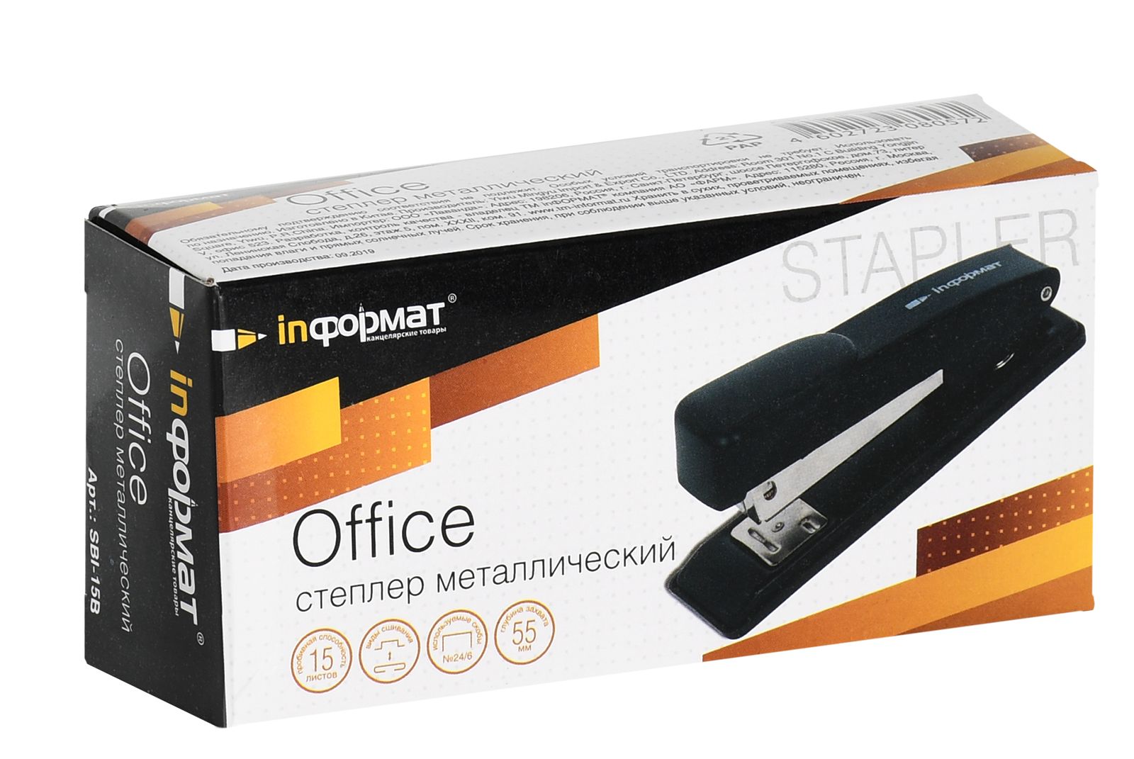 Цвет: черный Материал: металл Наличие антистеплера: Нет Регулятор глубины закладки бумаги: Нет Размер, см: 13,20 Высота, см: 6,00 Мин. партия и варианты упаковок: 1 / 12 / 72 Степлер INFORMAT Office № 24/6, 26/6 до 25 листов, металл, черный