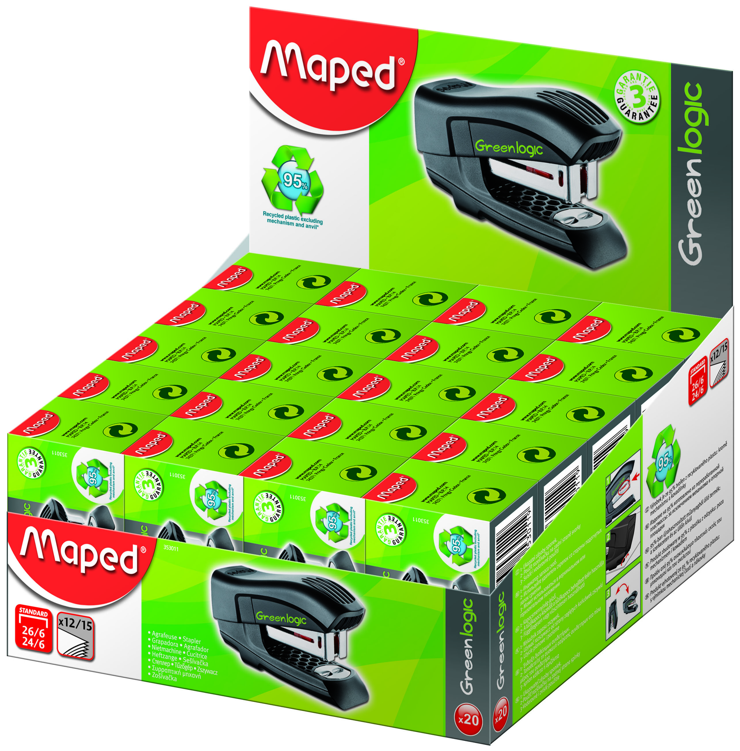 Материал: пластик Наличие антистеплера: Да Регулятор глубины закладки бумаги: Нет Размер скоб: 24/6, 26/6 Упаковка: картонная коробка Вид сшивания степлером: закрытый Мин. партия и варианты упаковок: 1 / 20 / 320 Степлер MAPED GREENLOGIC до 15 листов№ №24/6,26/6 пластик