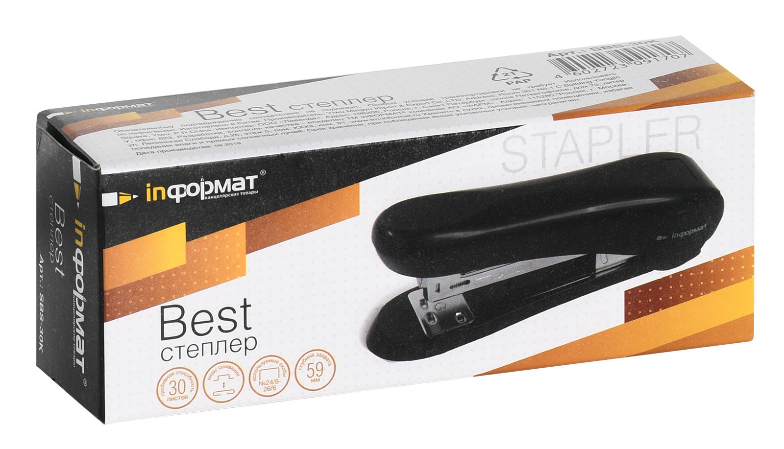Цвет: черный Материал: пластик Наличие антистеплера: Нет Регулятор глубины закладки бумаги: Нет Размер, см: 12,70 Высота, см: 4,60 Мин. партия и варианты упаковок: 1 / 12 / 96 Степлер INFORMAT Best №24/6, 26/6 до 30 листов, пластик, черный
