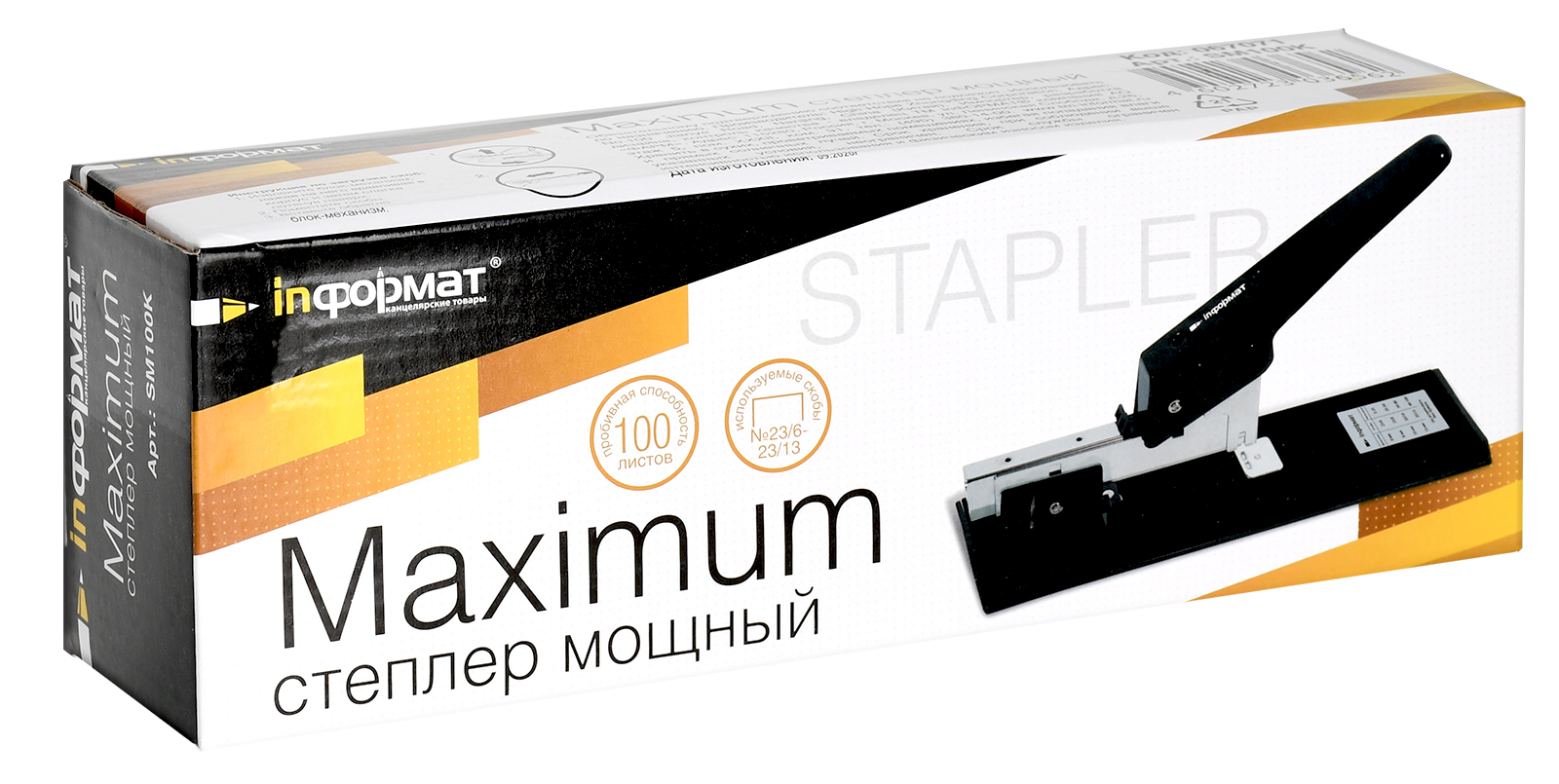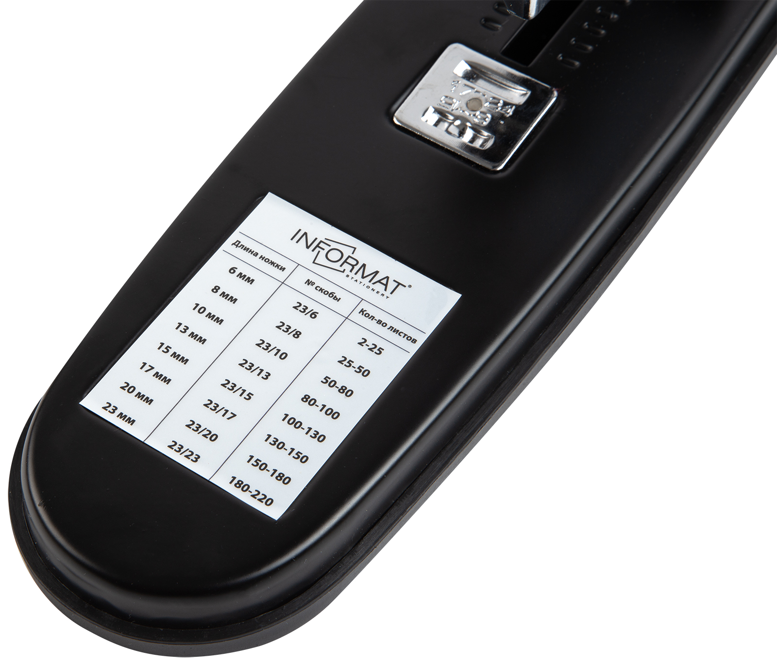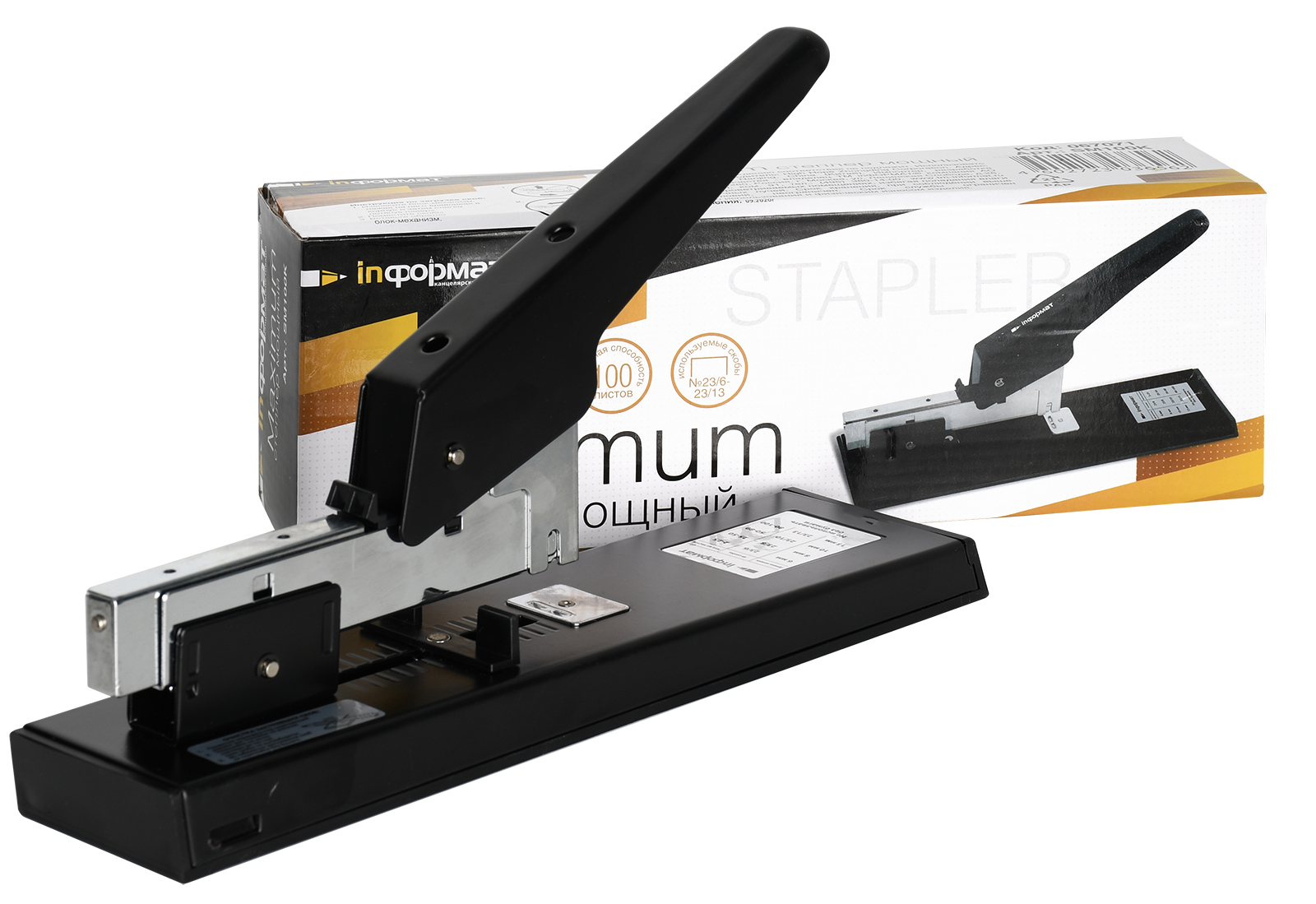 Цвет: черный Материал: металл Наличие антистеплера: Нет Регулятор глубины закладки бумаги: Да Размер, см: 28,50 Высота, см: 16,40 Мин. партия и варианты упаковок: 1 / 12 / 24 Степлер мощный INFORMAT MAXIMUM №23/6-23/13 до 100 листов, металл, черный