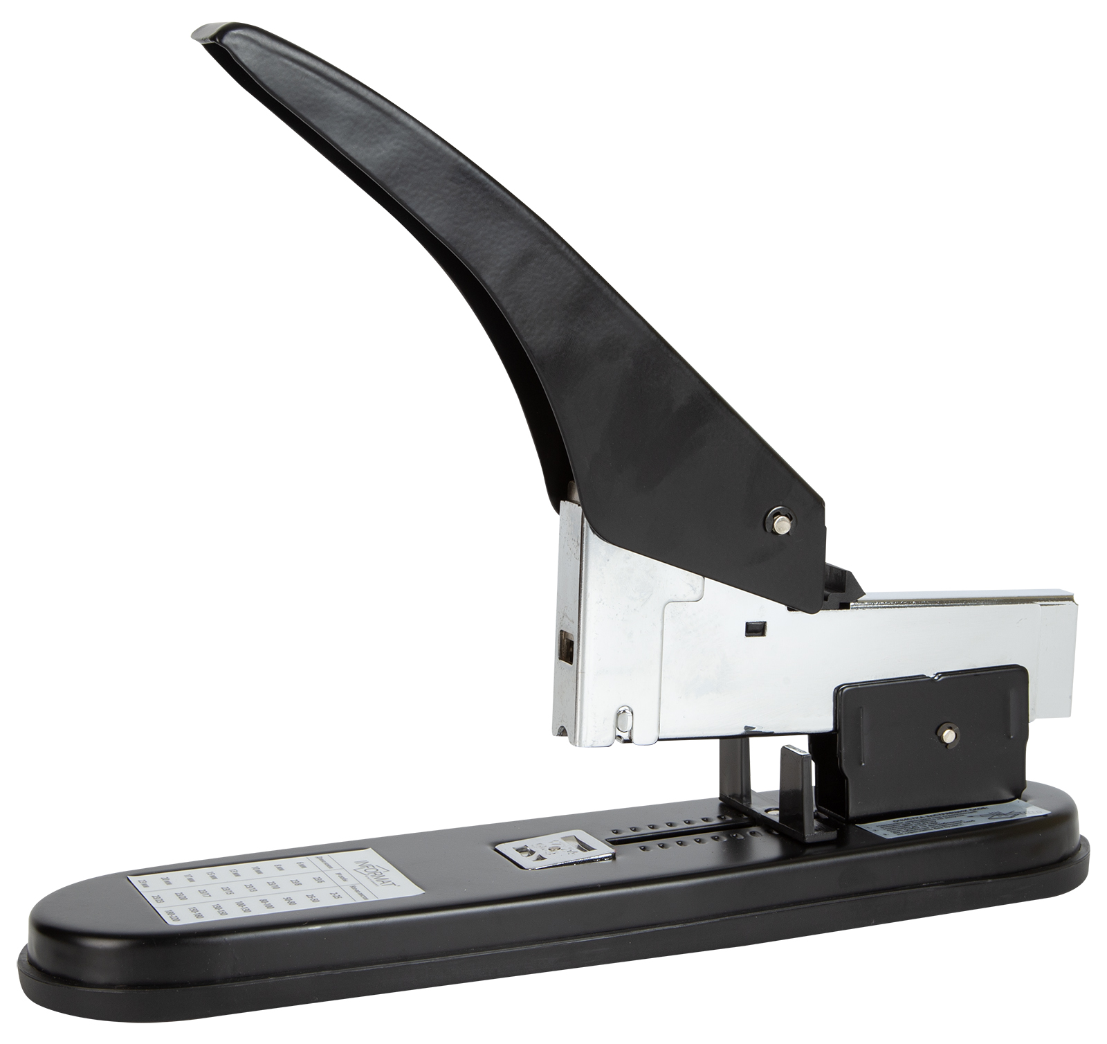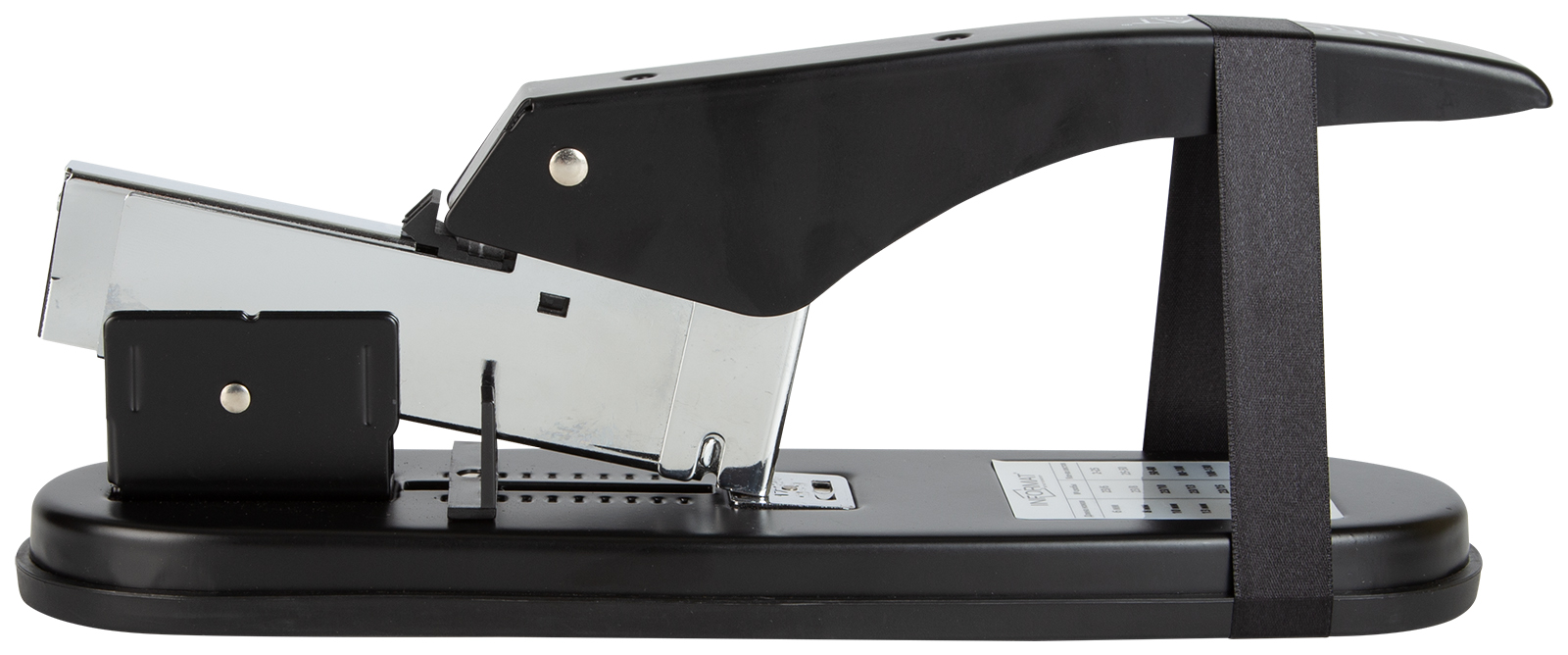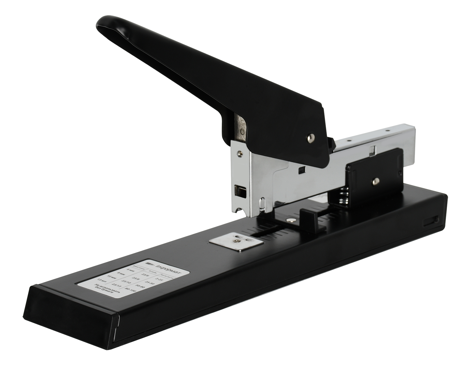 - Сверхмощные. Усиленные литые узлы и регулируемая глубина перфорации. Длинный рычаг позволяет снизить объем применяемой силы (до 30 %). Сверхмощные устройства могут сшивать большие объемы бумаги — от 50 до 100 листов и более.