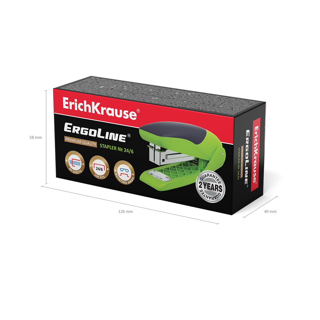 Цвет: салатовый Материал: пластик Наличие антистеплера: Нет Регулятор глубины закладки бумаги: Нет Размер, см: 5,80 Высота, см: 4,00 Мин. партия и варианты упаковок: 1 / 12 / 72 Степлер ErichKrause ERGOLINE №24/6 до 30 листов, пластик, салатовый