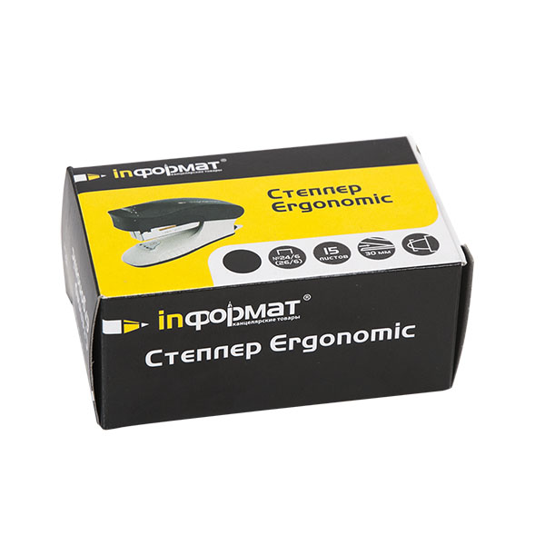 Цвет: черный Материал: пластик Наличие антистеплера: Да Регулятор глубины закладки бумаги: Нет Размер, см: 7,50 Высота, см: 4,50 Мин. партия и варианты упаковок: 1 / 10 / 120 / 240 Степлер INFORMAT ERGONOMICS №24/6, 26/6 до 15 листов, пластик, черный