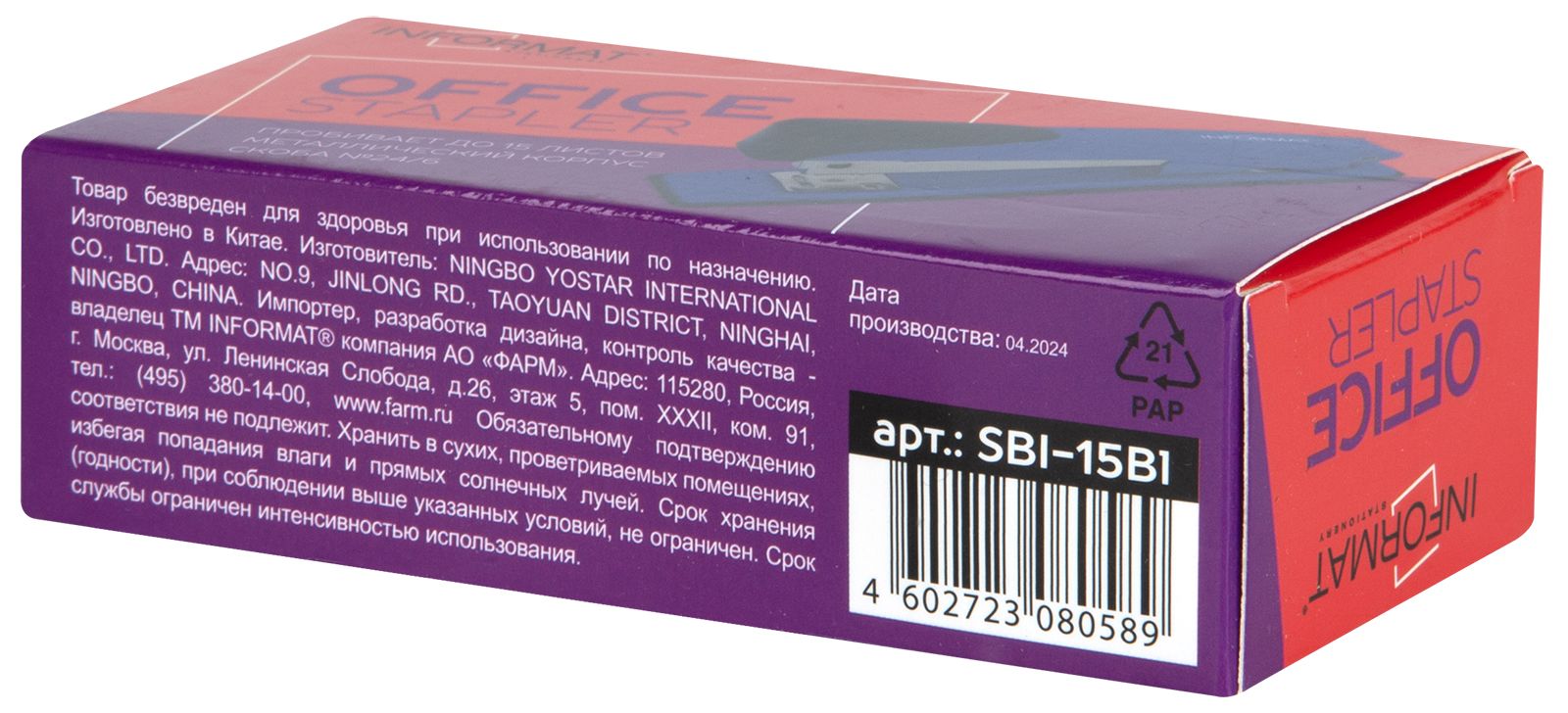 Цвет: синий Материал: металл Наличие антистеплера: Нет Регулятор глубины закладки бумаги: Нет Размер, см: 11,50 Высота, см: 5,40 Мин. партия и варианты упаковок: 1 / 12 / 120 Степлер INFORMAT Office №24/6 до 15 листов, металл, синий