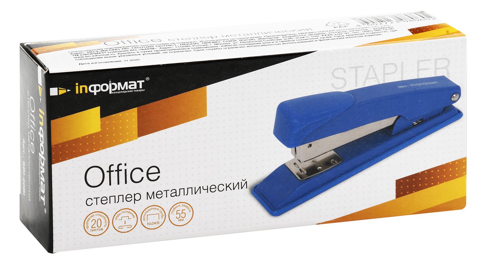Цвет: синий Материал: металл Наличие антистеплера: Нет Регулятор глубины закладки бумаги: Нет Размер, см: 13,50 Высота, см: 5,70 Мин. партия и варианты упаковок: 1 / 12 / 120 Степлер INFORMAT Office №24/6 до 20 листов, металл, синий