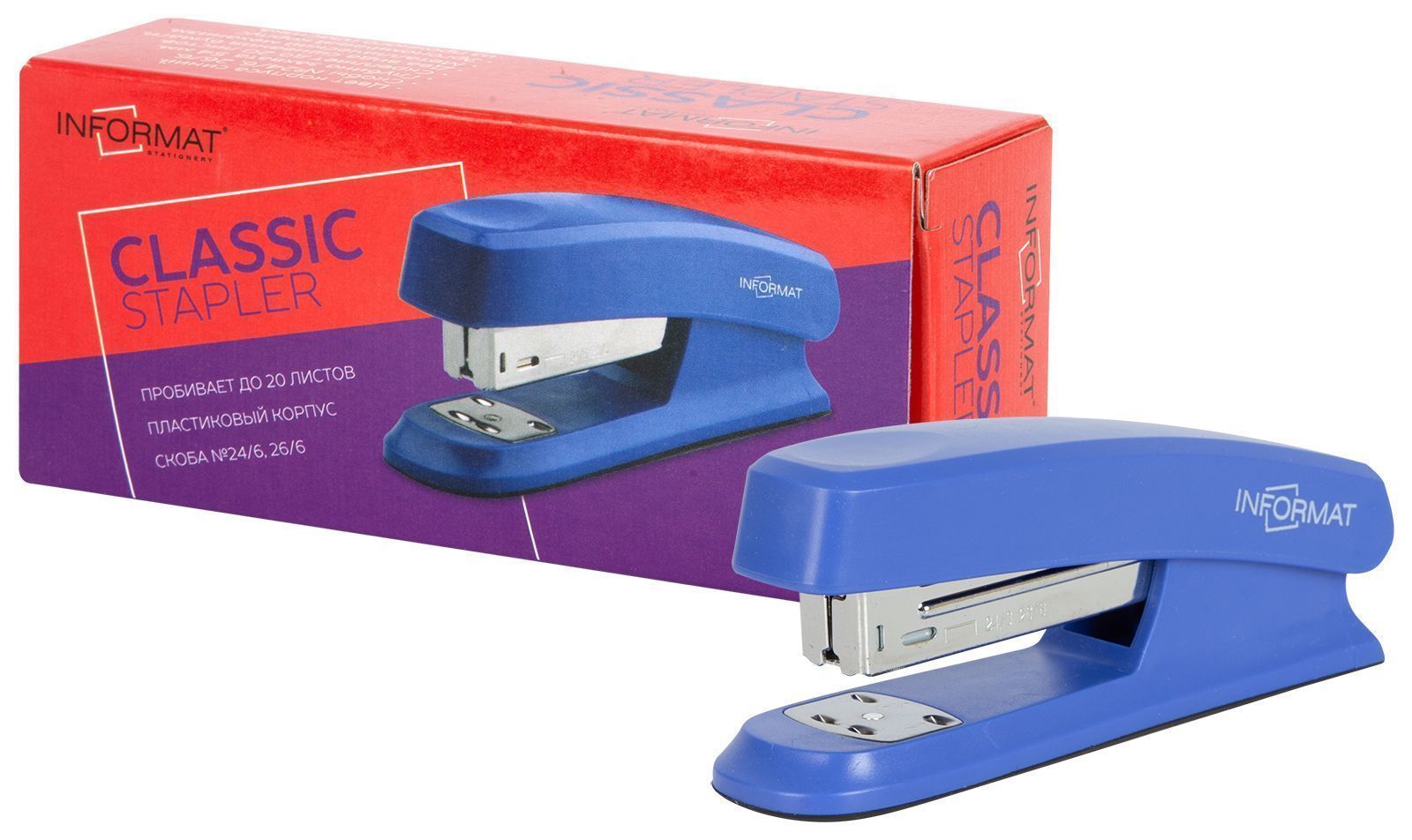 Степлеры INFORMATсерии Classic — представители классической офисной канцелярии. Эргономичный корпус изготовлен из высококачественного пластика, механизм цельнометаллический. Обеспечат надежное скрепление документов и офисных бумаг до 20 листов. Без антистеплера. Цвет корпуса подобран в консервативных офисных тонах. Имеет два вида сшивания – открытый и закрытый. Окно контроля за количеством оставшихся скоб, скобы — №24/6 и 26/6. Глубина захвата бумаги – 54 мм, без возможности регулирования глубины закладки бумаги. Габариты: высота — 46 мм, ширина — 35 мм, длина — 121 мм.