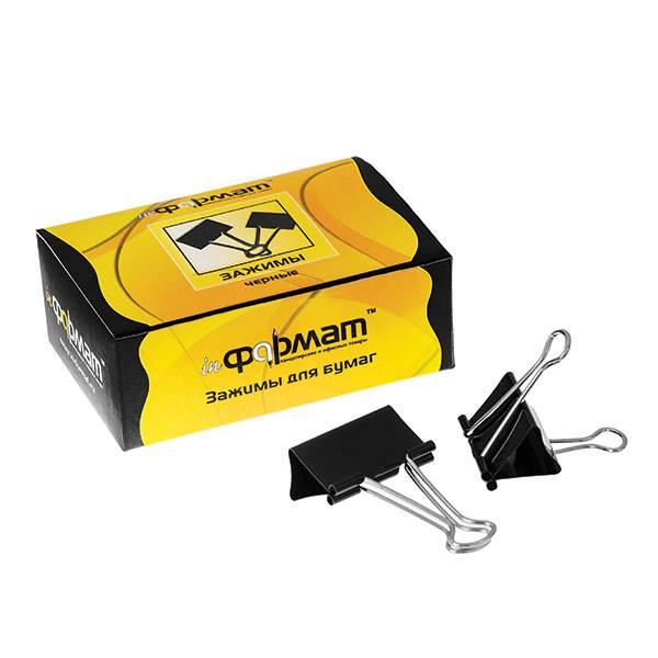 Изготовлены из металла, размер — 41 мм. Количество скрепляемых листов — 200. Цвет — черный. В упаковке по 12 шт.