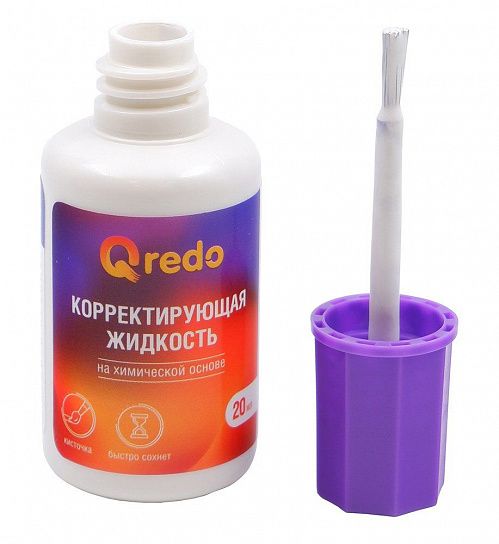 Корректирующая жидкость Qredo предназначена для исправления рукописных записей и печатного текста. Изготовлена на химической основе, быстро высыхает, позволяет оперативно вносить корректировку. Пластиковый флакон оснащен колпачком с кистью для нанесения ровного слоя жидкости.Объем 20 мл. В транспортной упаковке 12 флаконов.