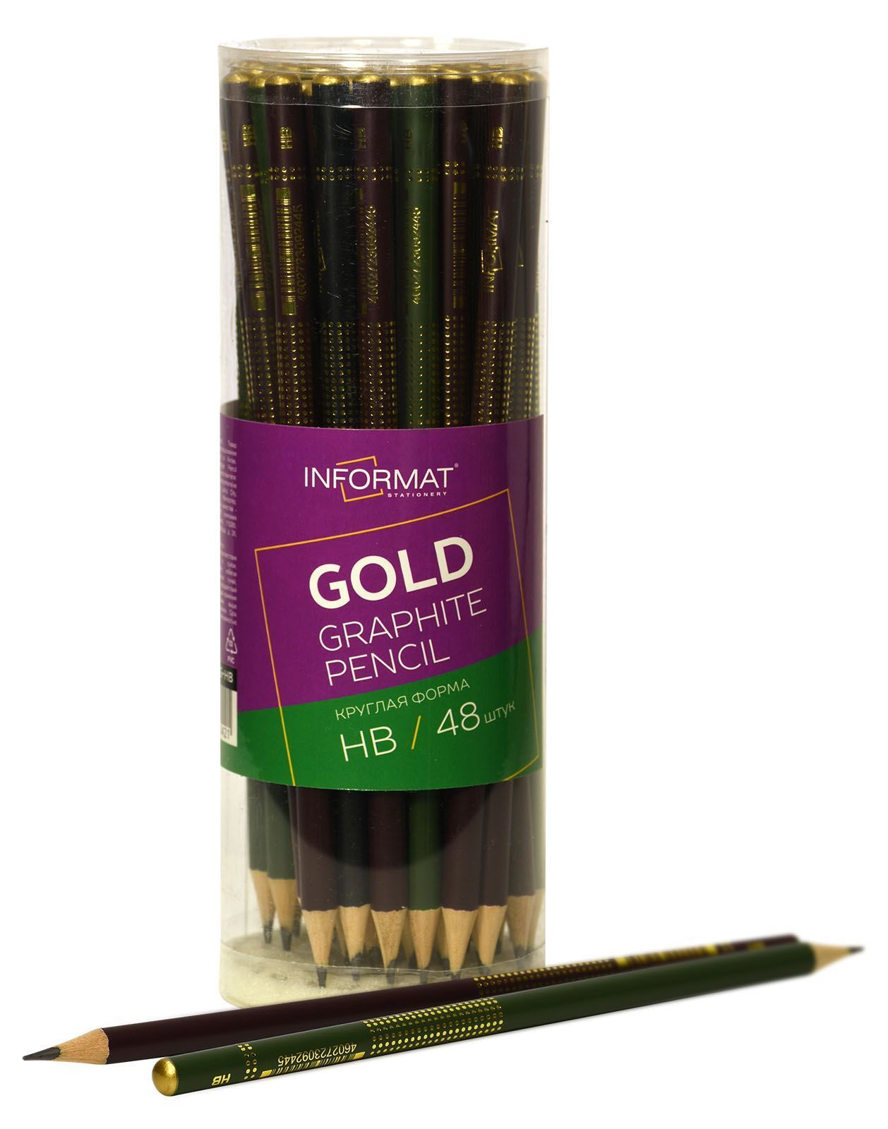 Карандаш чернографитный без ластика, серия GOLD, высококачественная древесина, трехгранный корпус, заточенный в тубусе 48 шт. Твердость — HB.