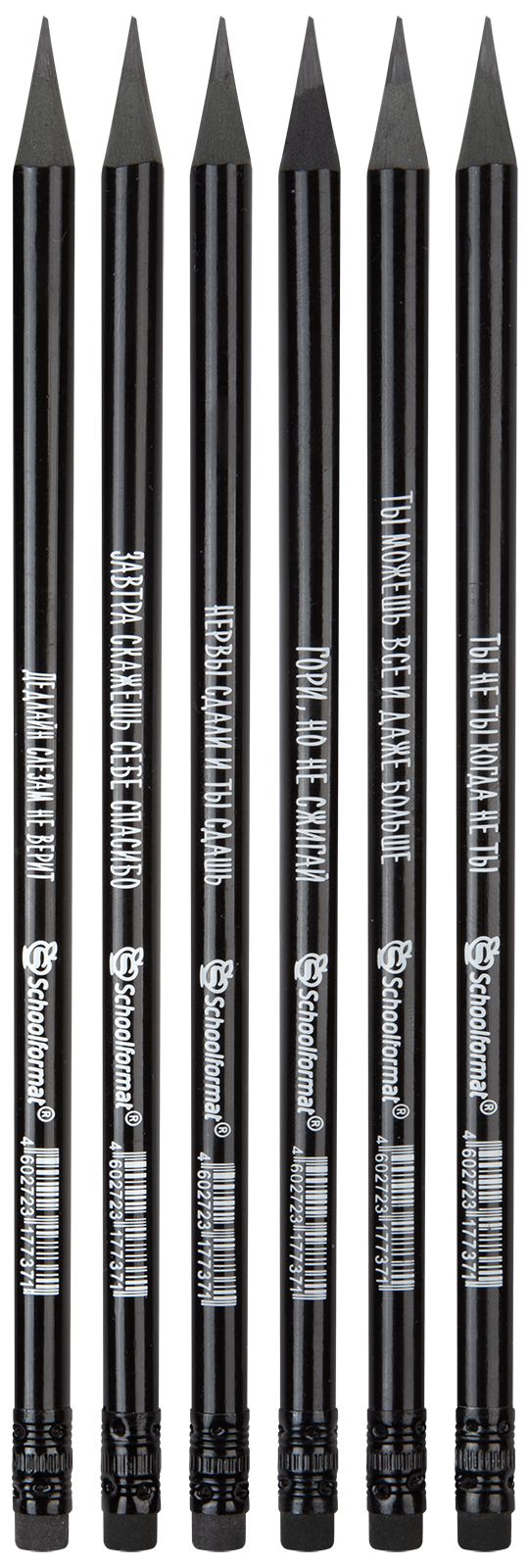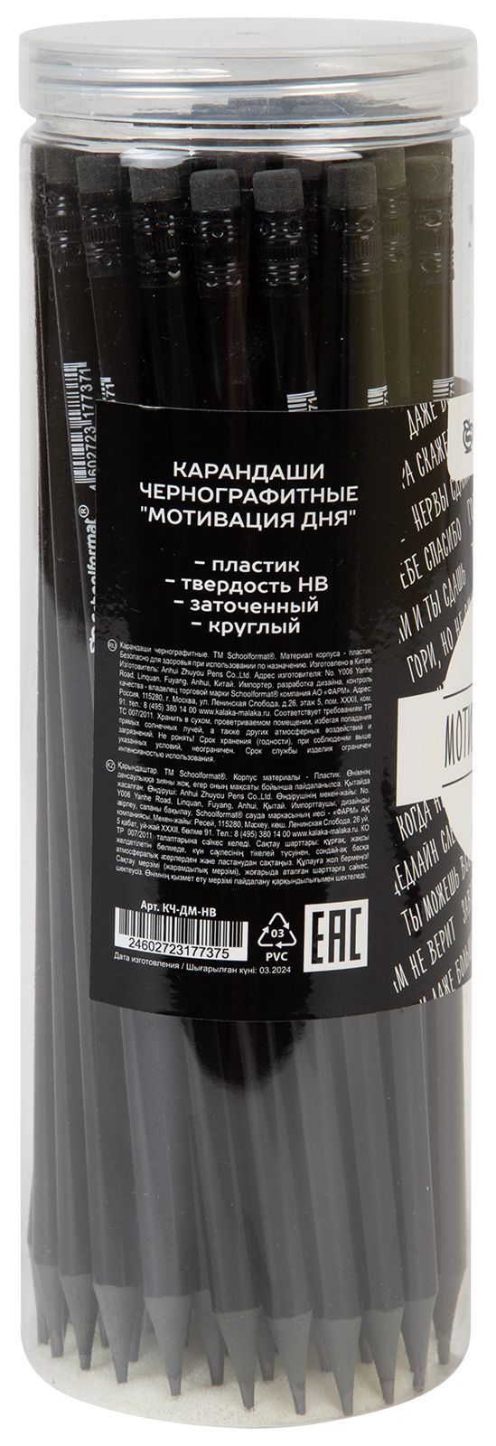 Наличие европодвеса: Нет Мягкость грифеля: НВ Цвет корпуса: черный Наличие индивидуального штрих-кода: Нет Заточенный: Нет Форма корпуса: круглый Мин. партия и варианты упаковок: 1 / 48 / 288 / 2304 Карандаш чернографитный пластиковый Schoolformat МОТИВАЦИЯ ДНЯ НВ с ластиком, круглый, тубус