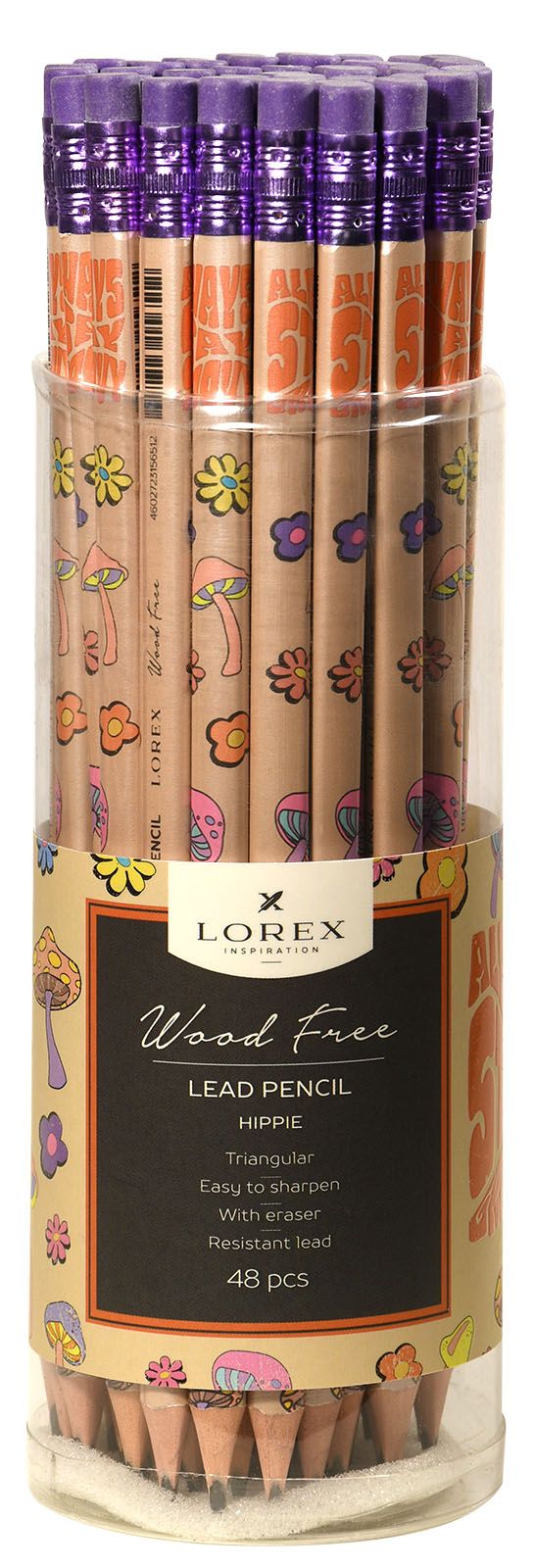 Наличие европодвеса: Нет Мягкость грифеля: НВ Цвет корпуса: дизайн Наличие индивидуального штрих-кода: Да Заточенный: Да Форма корпуса: трехгранный Мин. партия и варианты упаковок: 1 / 48 / 576 / 2304 Карандаш чернографитный пластиковый LOREX WOOD FREE HIPPIE НВ с ластиком, заточенный, трехгранный, принт на корпусе, тубус