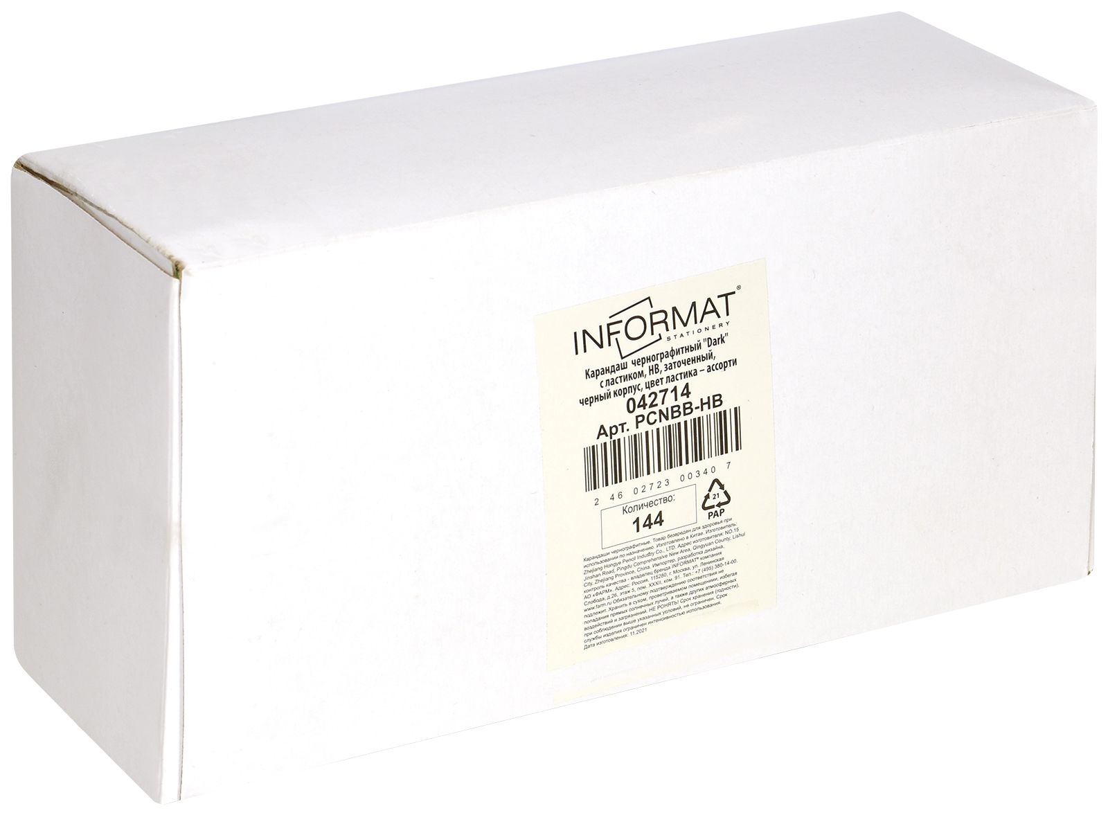 Наличие европодвеса: Нет Мягкость грифеля: НВ Цвет корпуса: ассорти Наличие индивидуального штрих-кода: Да Заточенный: Да Форма корпуса: шестигранный Мин. партия и варианты упаковок: 1 / 144 / 2880 Карандаш чернографитный деревянный INFORMAT Office НВ с ластиком, заточенный, шестигранный, принт на корпусе, картонная коробка