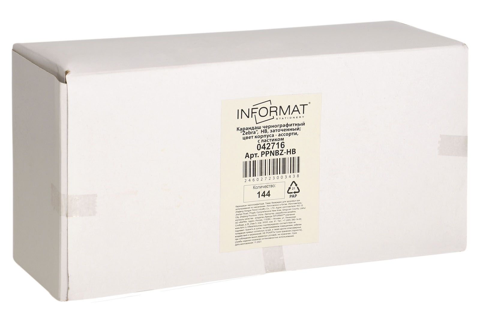 Наличие европодвеса: Нет Мягкость грифеля: НВ Цвет корпуса: ассорти Наличие индивидуального штрих-кода: Да Заточенный: Да Форма корпуса: шестигранный Мин. партия и варианты упаковок: 1 / 144 / 2880 Карандаш чернографитный деревянный INFORMAT Zebra НВ с ластиком, заточенный, шестигранный, принт на корпусе, картонная коробка