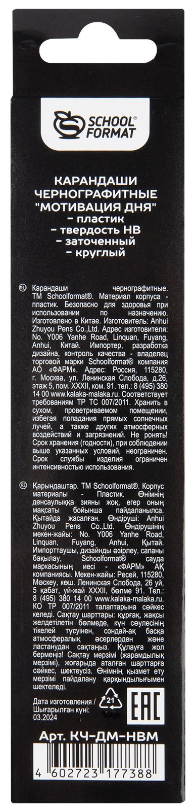 Количество в упаковке, шт: 6 Наличие европодвеса: Да Цвет корпуса: черный Заточенный: Да Форма корпуса: круглый Упаковка: цветная коробка Мин. партия и варианты упаковок: 1 / 24 / 480 Набор чернографитных карандашей пластиковые Schoolformat МОТИВАЦИЯ ДНЯ 6 шт НВ с ластиком, заточенные, круглые, принт на корпусе, цветная ко